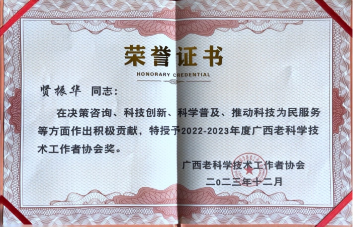近日,我校老科协荣获“2022-2023年度广西老科学技术工作者协会先进集体奖”,退休教师贤振华同志被授予2022-2023年度广西老科学技术工作者协会奖。这两项荣誉的取得,是广西老科学技术工作者协会对我校老科协在决策咨询、科技创新、科学普及、推动科技为民服务等方面所作贡献的充分肯定。