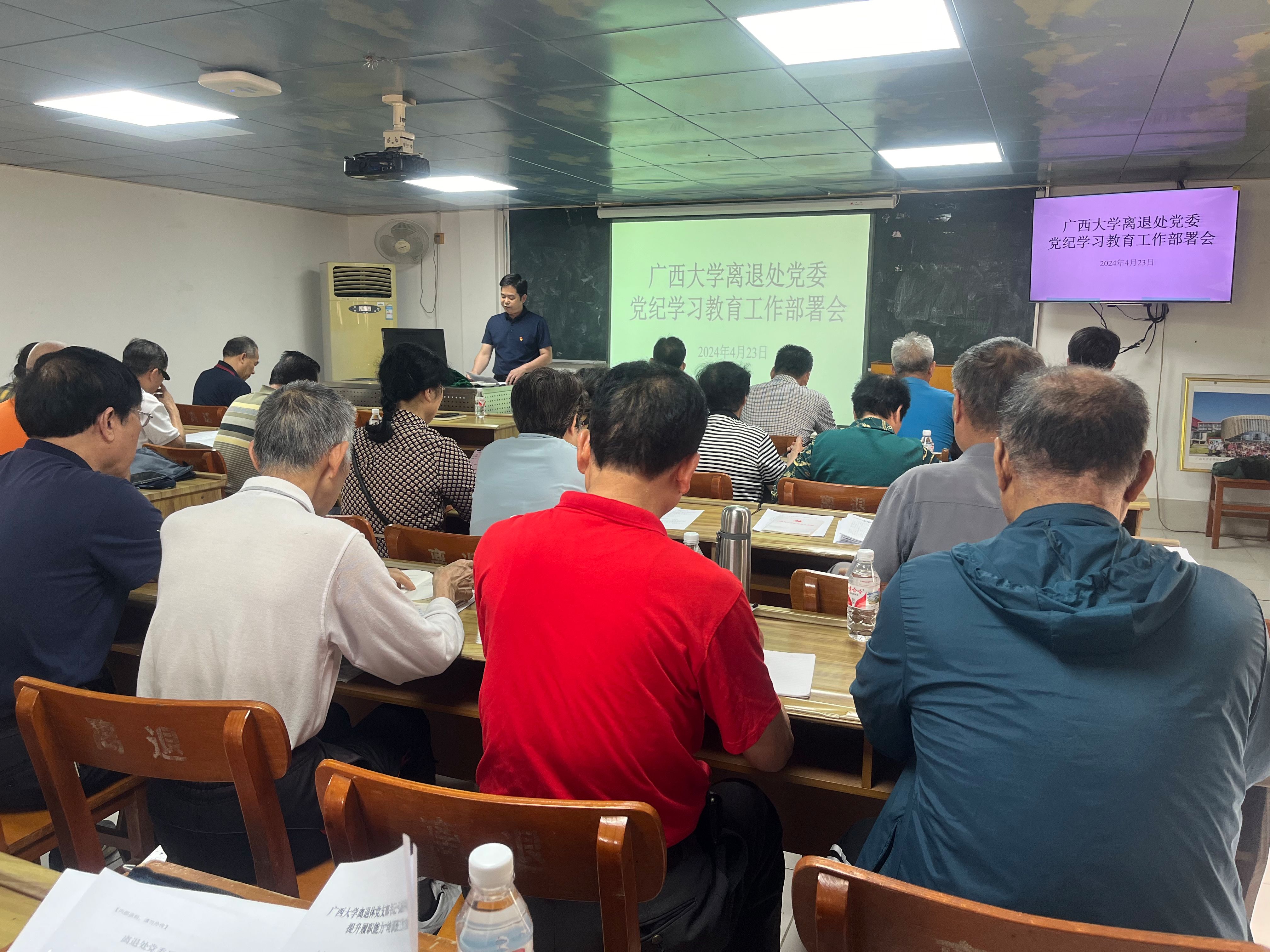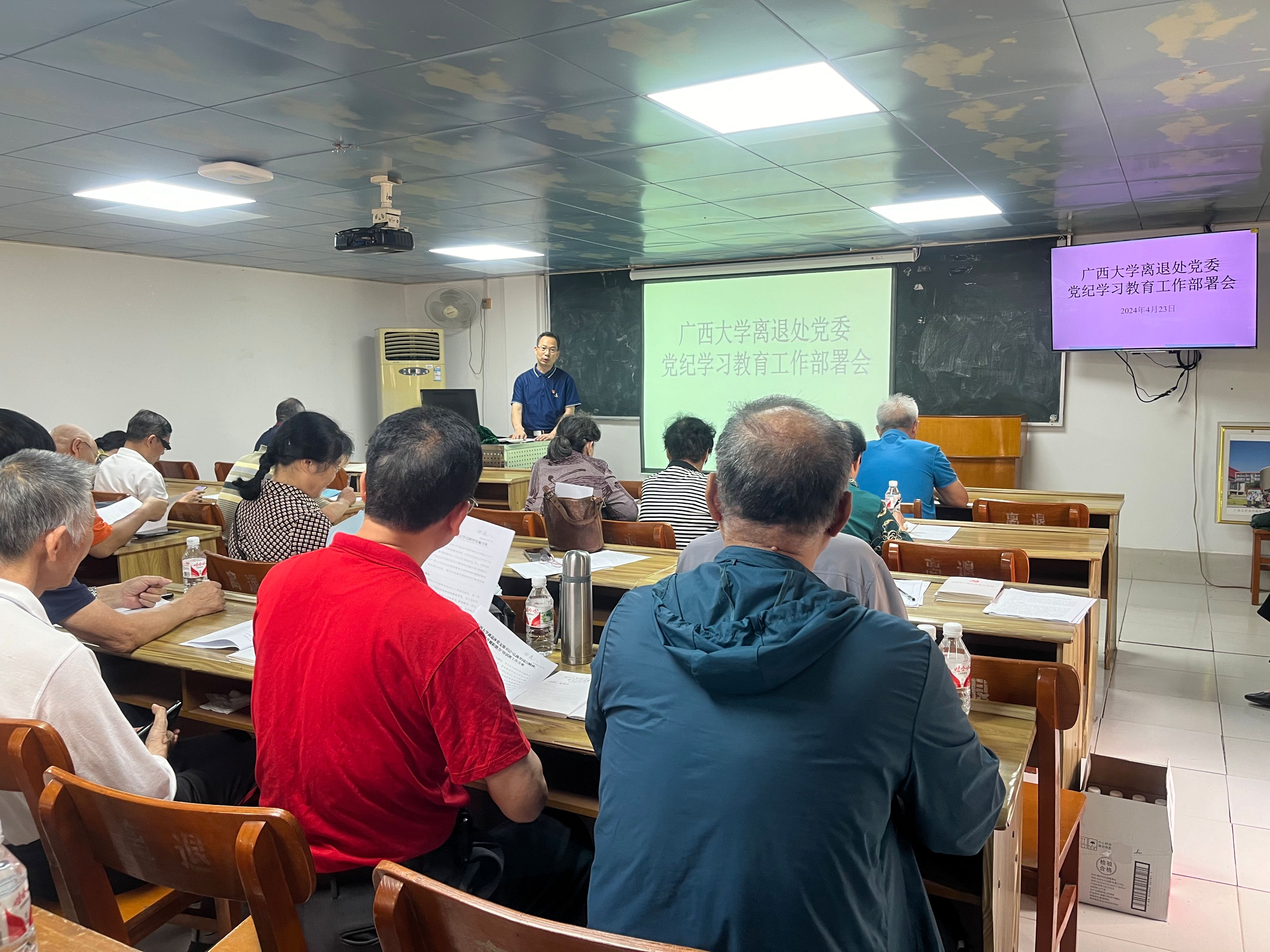 4月23日,我处党委在东校园离退休教职工活动中心召开党纪学习教育工作部署会议,处党委委员、纪委委员和全体党支部书记参加会议。会上,处党委副书记何禧严对离退处党委党纪学习教育工作做了部署。处党委书记郑雪明强调,党员领导干部要带头学习、做出表率;党委委员要对所联系党支部进行全覆盖、全程指导;党支部要对《中国共产党纪律处分条例》学习教育做到内容全覆盖,对象全覆盖;离退休党员要重点学习“对违反政治纪律行为的处分”的有关条例。(覃美珍/文 杨玉君/图)