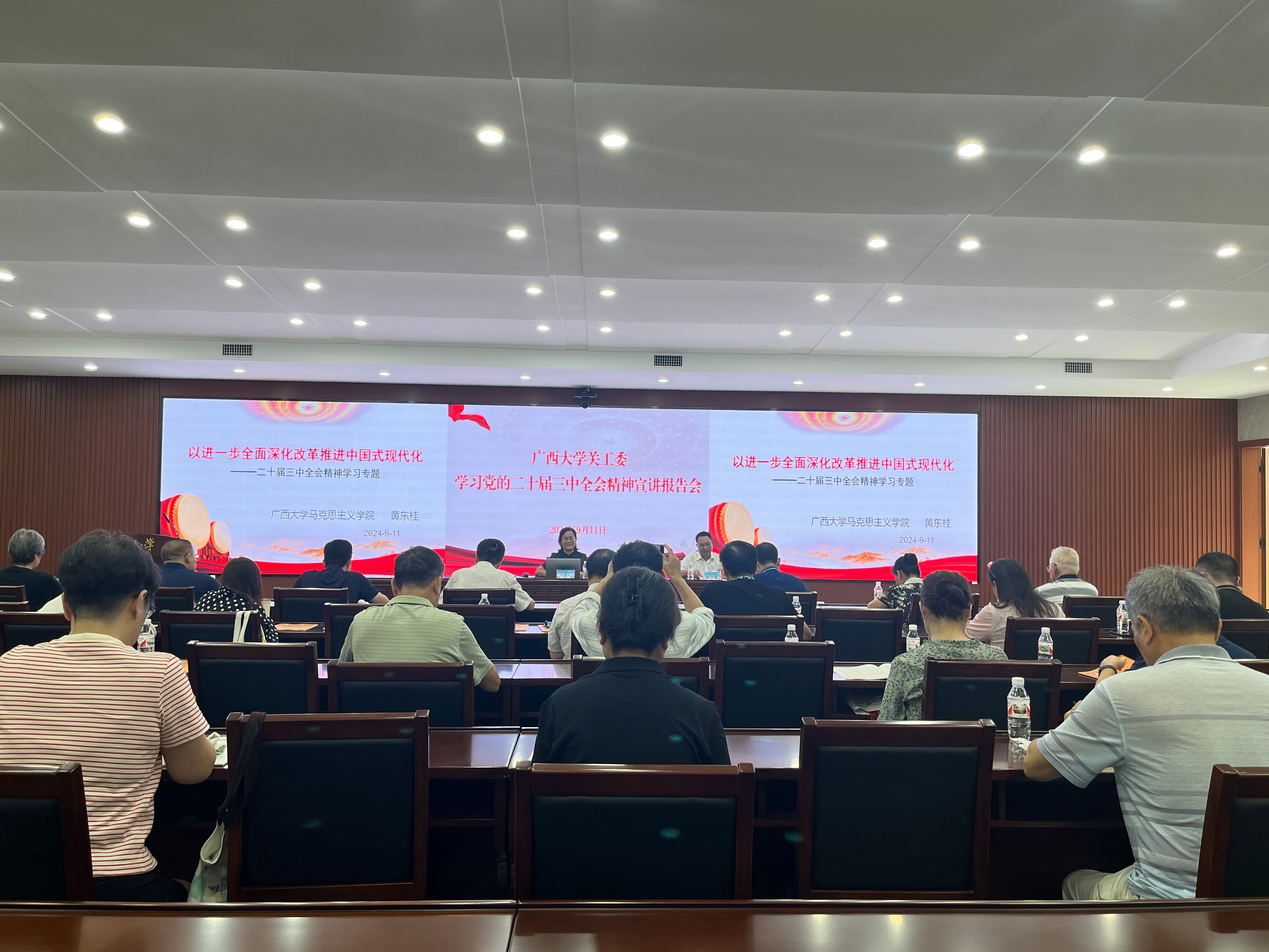 9月11日上午,校关工委在君武馆第二会议室组织学习贯彻党的二十届三中全会精神宣讲报告会。黄东桂教授做题为《以进一步全面深化改革推进中国式现代化》的报告。校关工委常务副主任石远吉主持报告会。