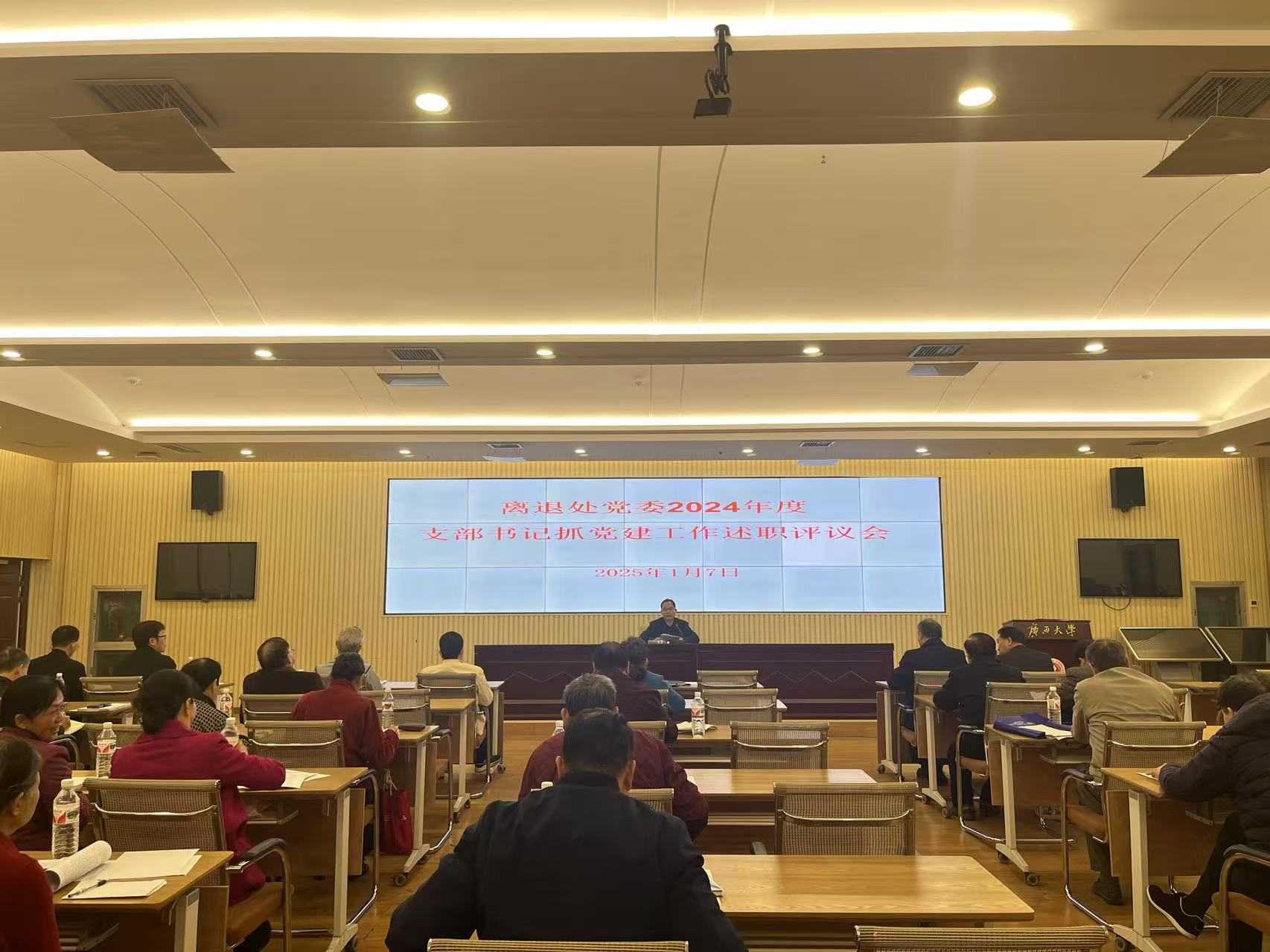 2025年1月7日上午,离退处党委组织召开了2024年度离退休党支部书记抓党建工作述职评议会,采用现场述职和书面述职相结合的方式开展述职评议活动。12个退休党支部书记参加现场述职,其他支部以书面形式述职,会议还对全体党支部书记进行述职测评。