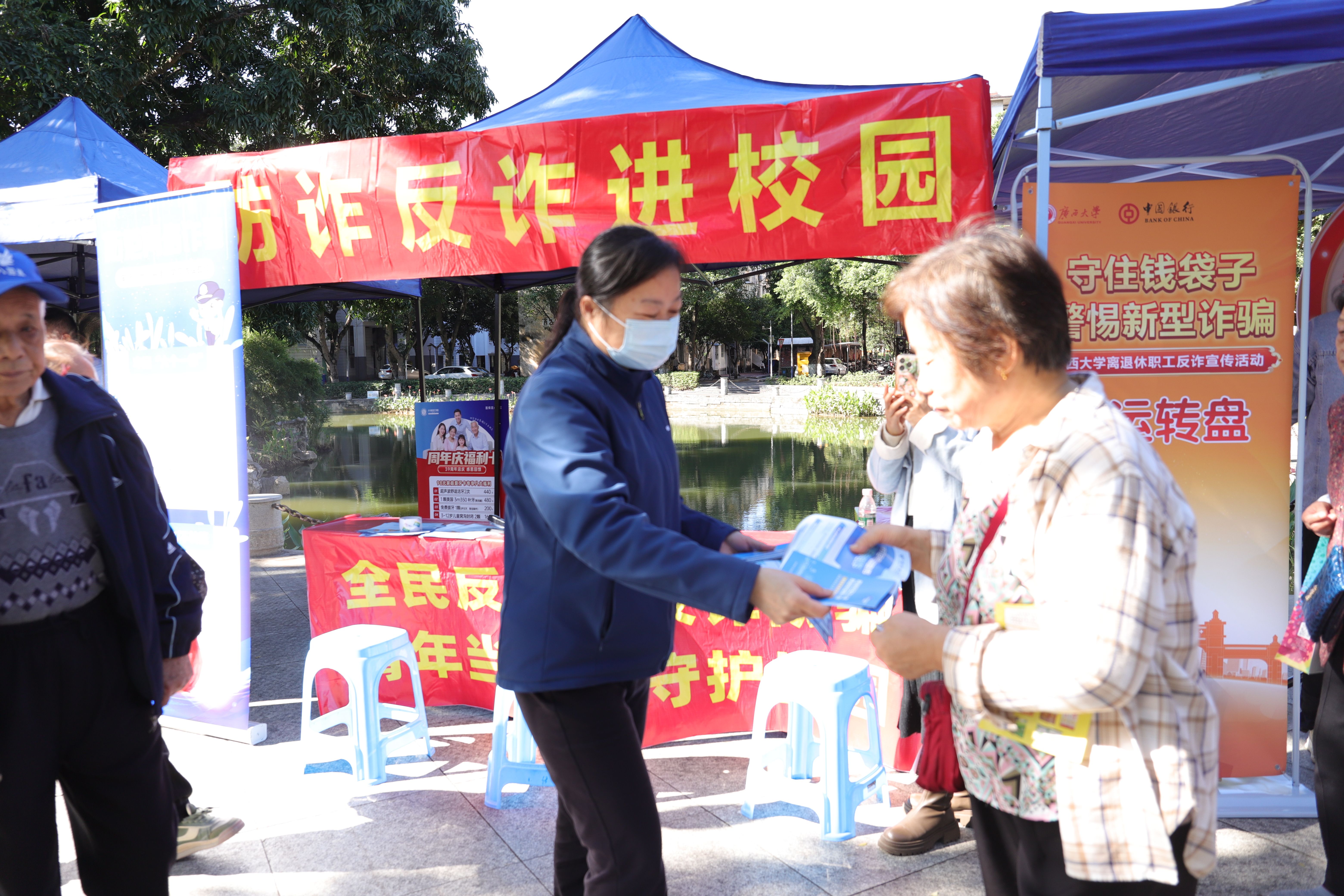老年趣味运动会期间离退处联合南宁市第八人民医院、泰康之家桂园、中国银行西大分行、西大社区和西大派出所等单位,开展了义诊和以“守住钱袋子 警惕新型诈骗”为主题的防范电信网络诈骗宣传活动。
