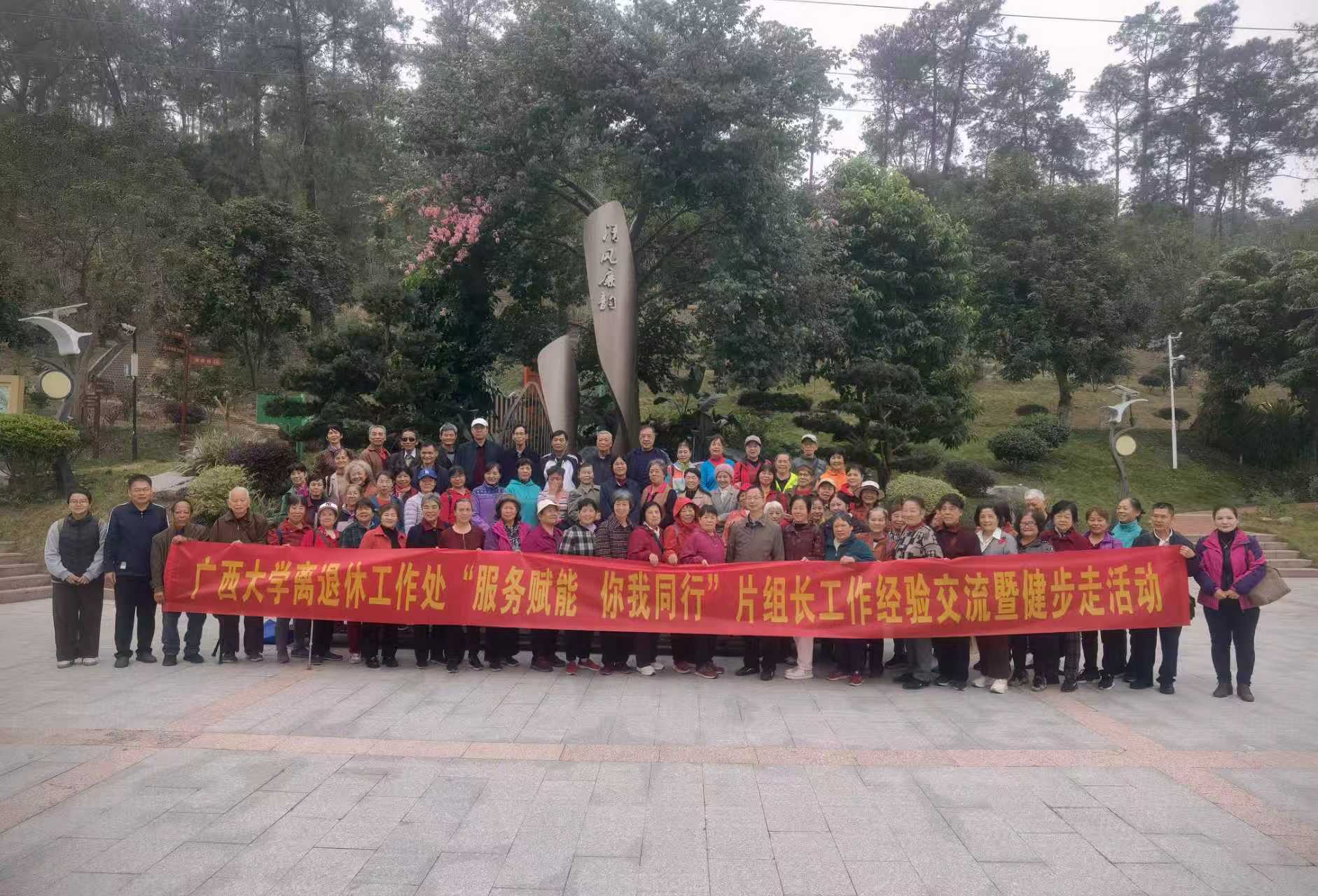 12月4日上午,离退处组织片组长到南宁市立新森林人家举办“服务赋能·你我同行”工作经验交流暨健步走活动,来自全校各教工住宅区的片长、楼栋组长和工作人员共计80人参加。