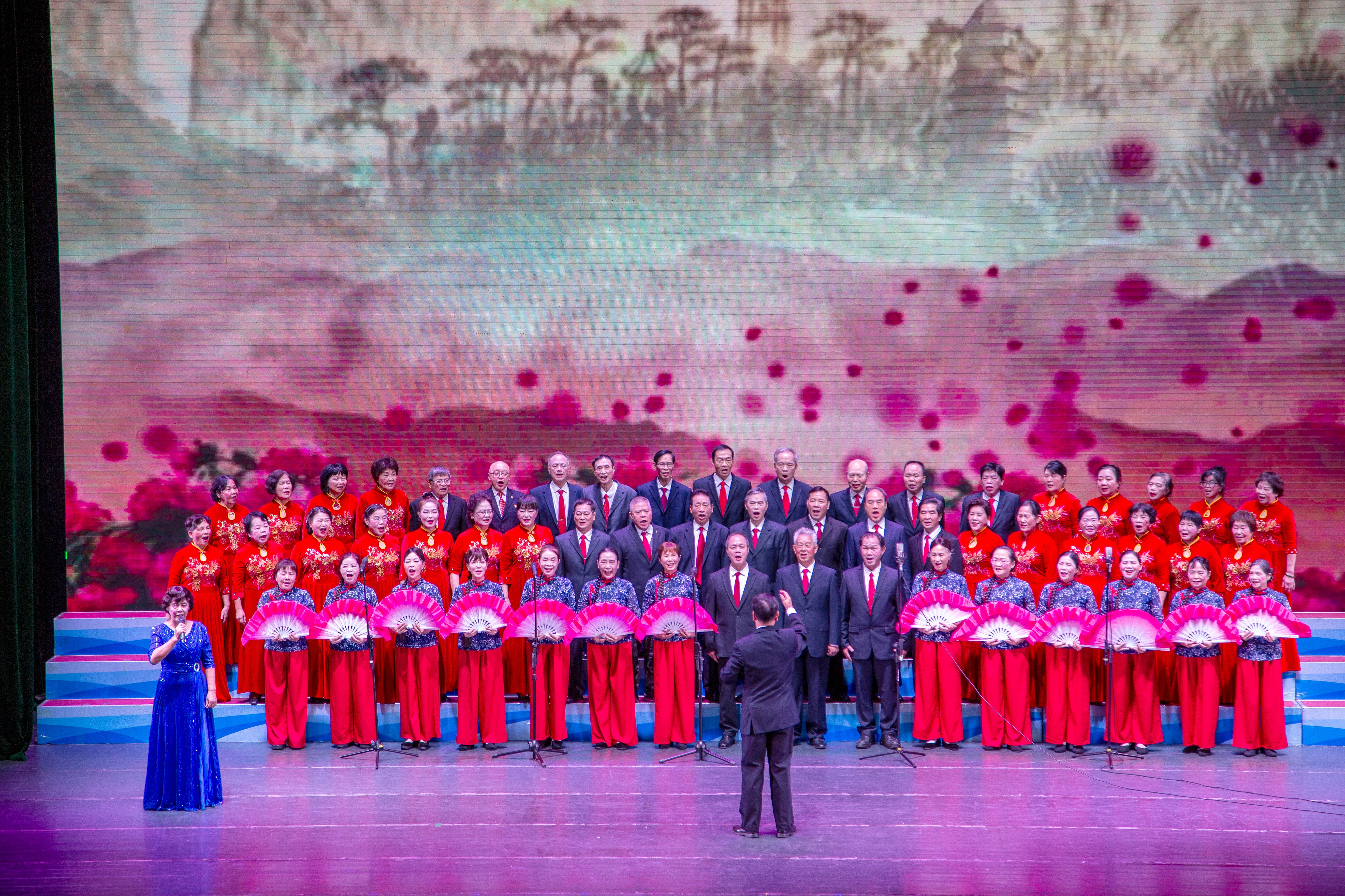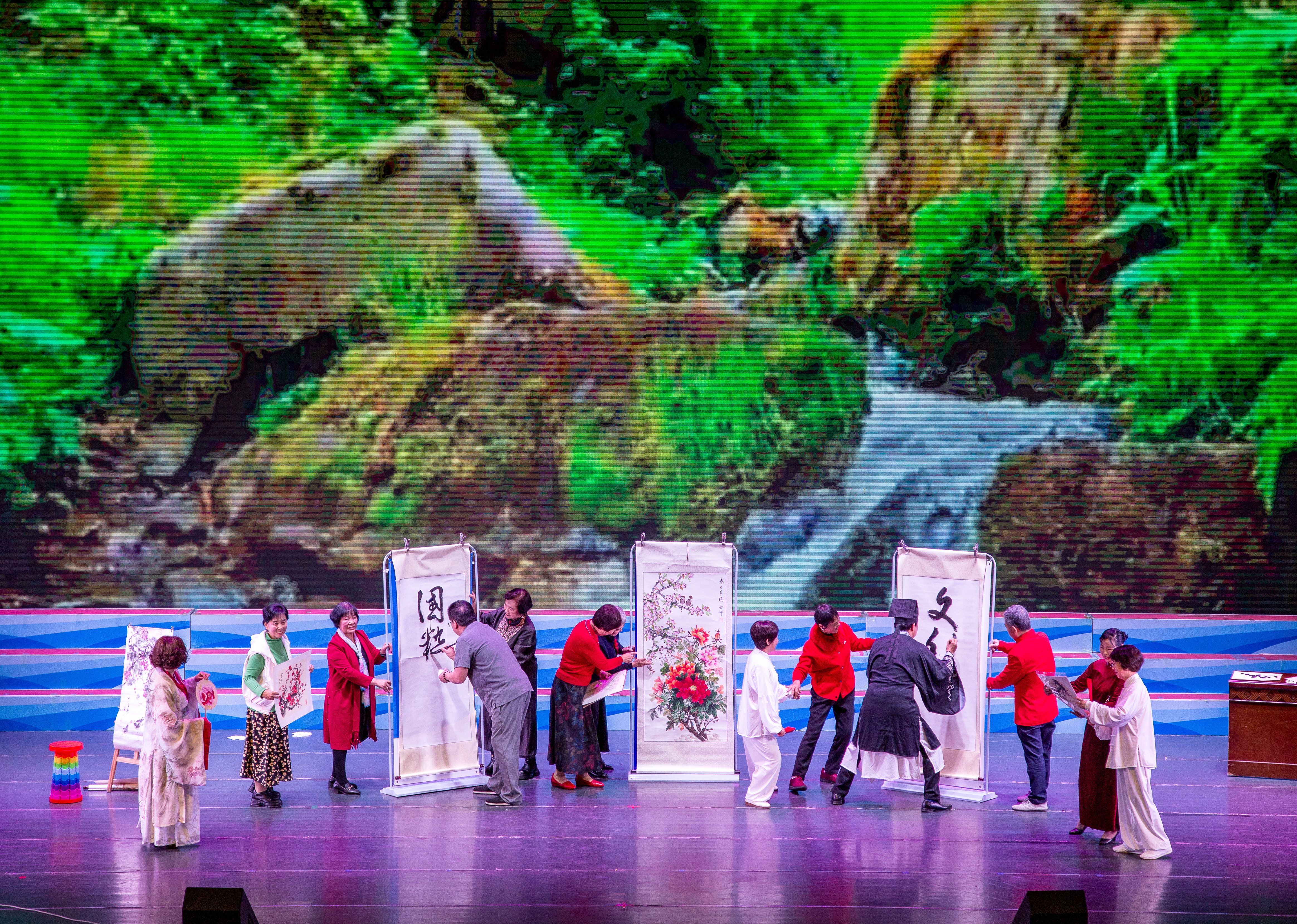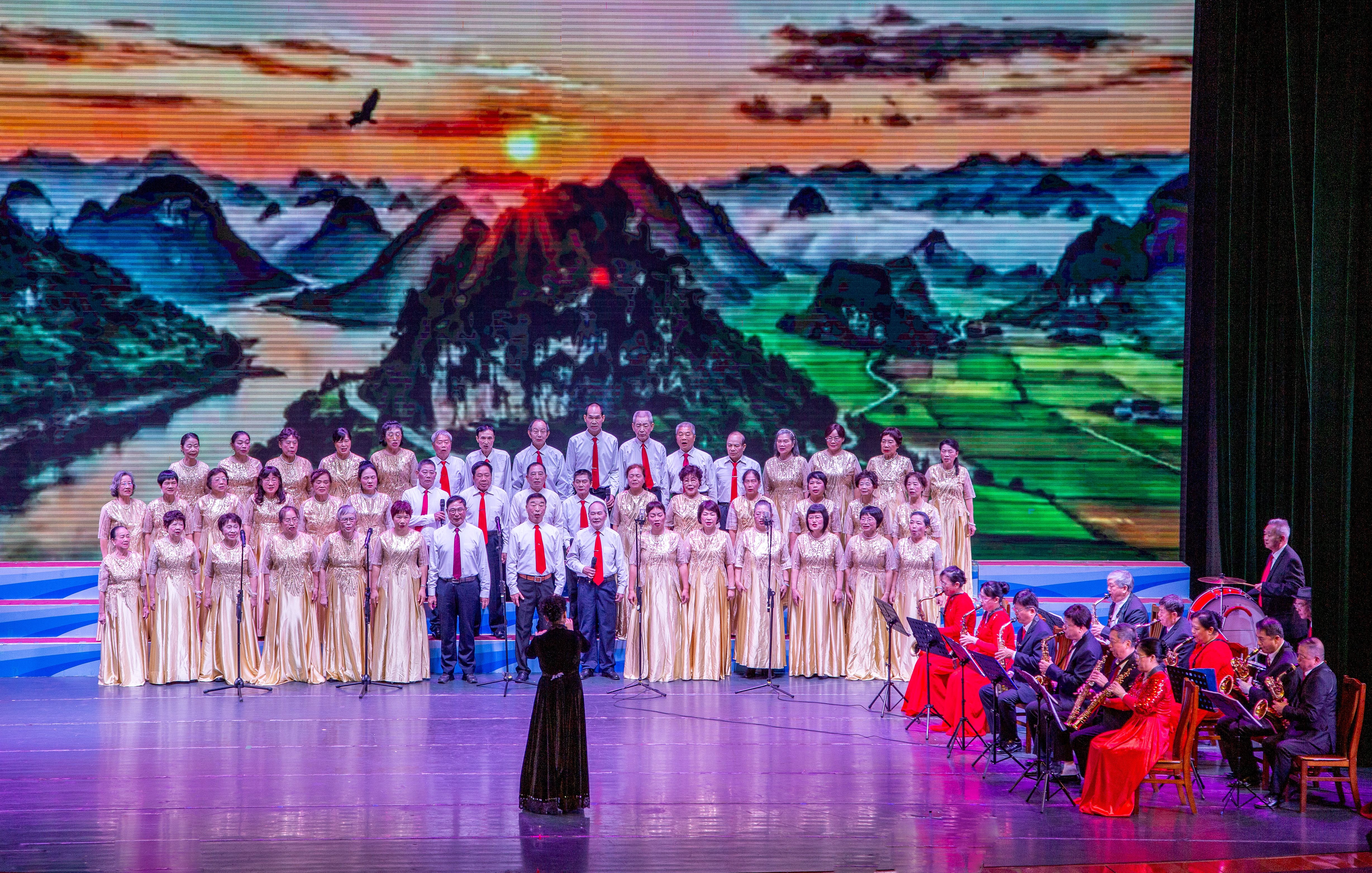 参加这次文艺演出的有20个活动队,文艺分会舞蹈秀《民族团结一家亲》等节目热情欢快,彰显风采;书画分会的情景剧《弘扬国粹》现场挥毫泼墨,抒发情怀;体育分会的肩颈操、太极剑表演充满活力,展现自信。老同志们心怀感恩之情,把银龄群体的绚丽风采以歌舞的形式绽放在年会的舞台上,用幸福的歌声和欢快的舞姿讴歌伟大中国共产党的坚强领导,赞颂伟大祖国的繁荣昌盛,赞美我们美好的幸福生活。