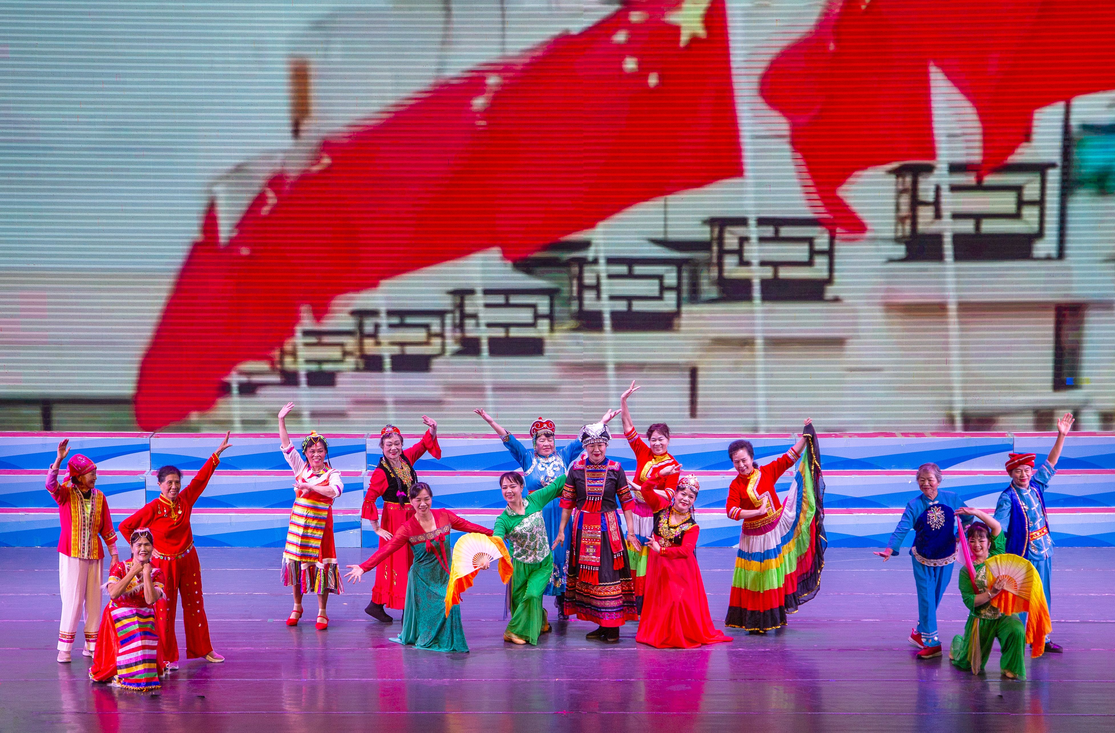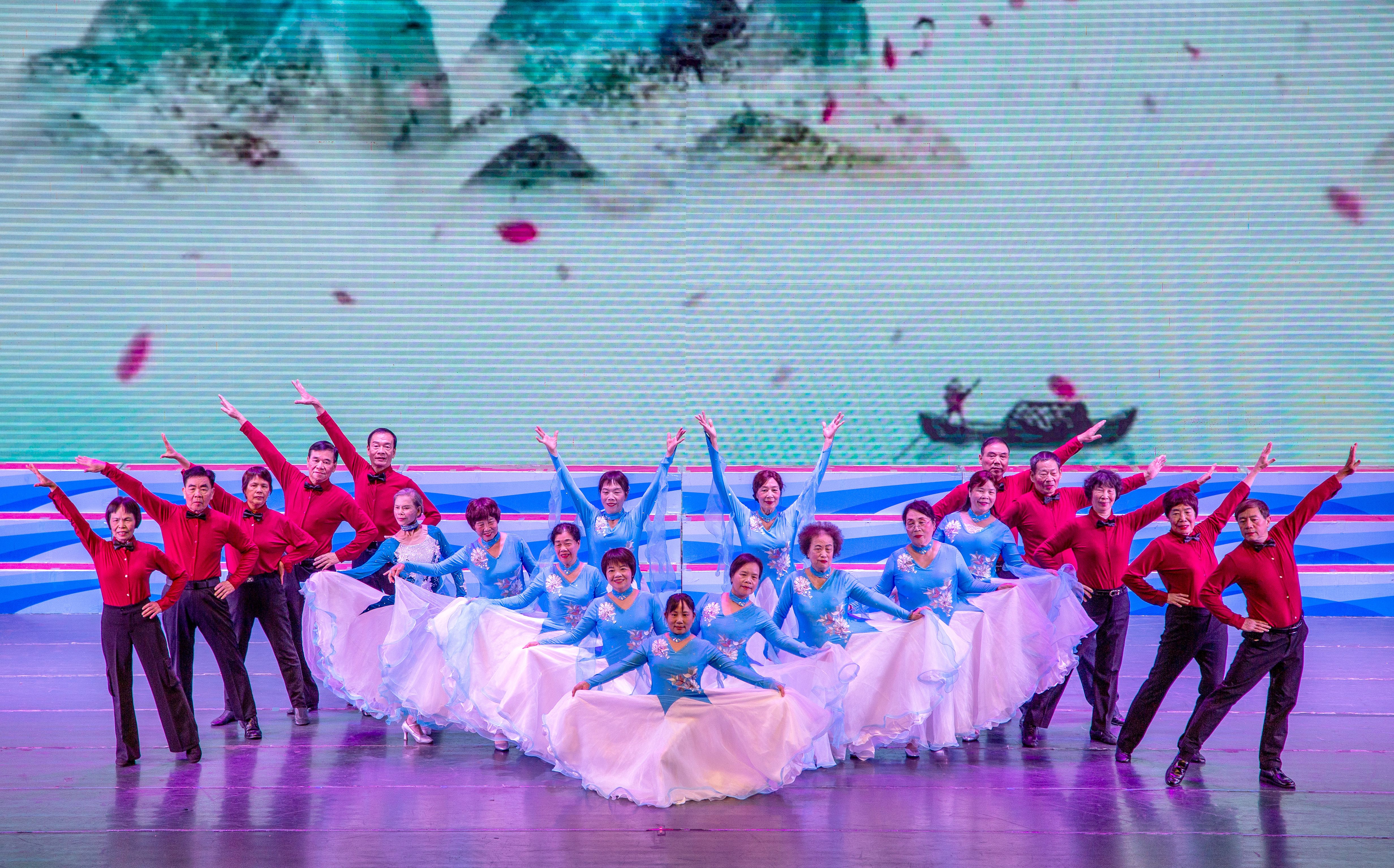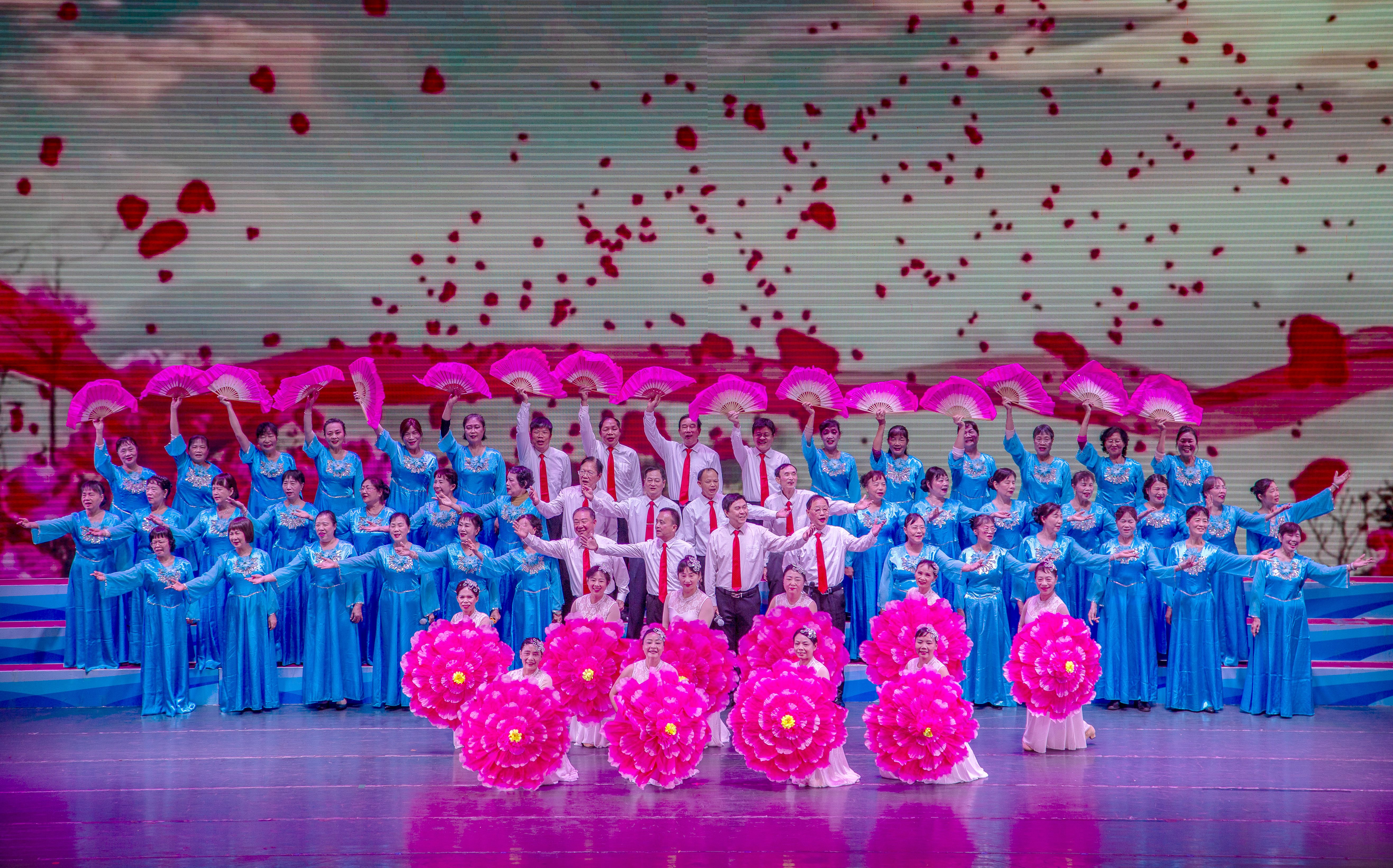 参加这次文艺演出的有20个活动队,文艺分会舞蹈秀《民族团结一家亲》等节目热情欢快,彰显风采;书画分会的情景剧《弘扬国粹》现场挥毫泼墨,抒发情怀;体育分会的肩颈操、太极剑表演充满活力,展现自信。老同志们心怀感恩之情,把银龄群体的绚丽风采以歌舞的形式绽放在年会的舞台上,用幸福的歌声和欢快的舞姿讴歌伟大中国共产党的坚强领导,赞颂伟大祖国的繁荣昌盛,赞美我们美好的幸福生活。