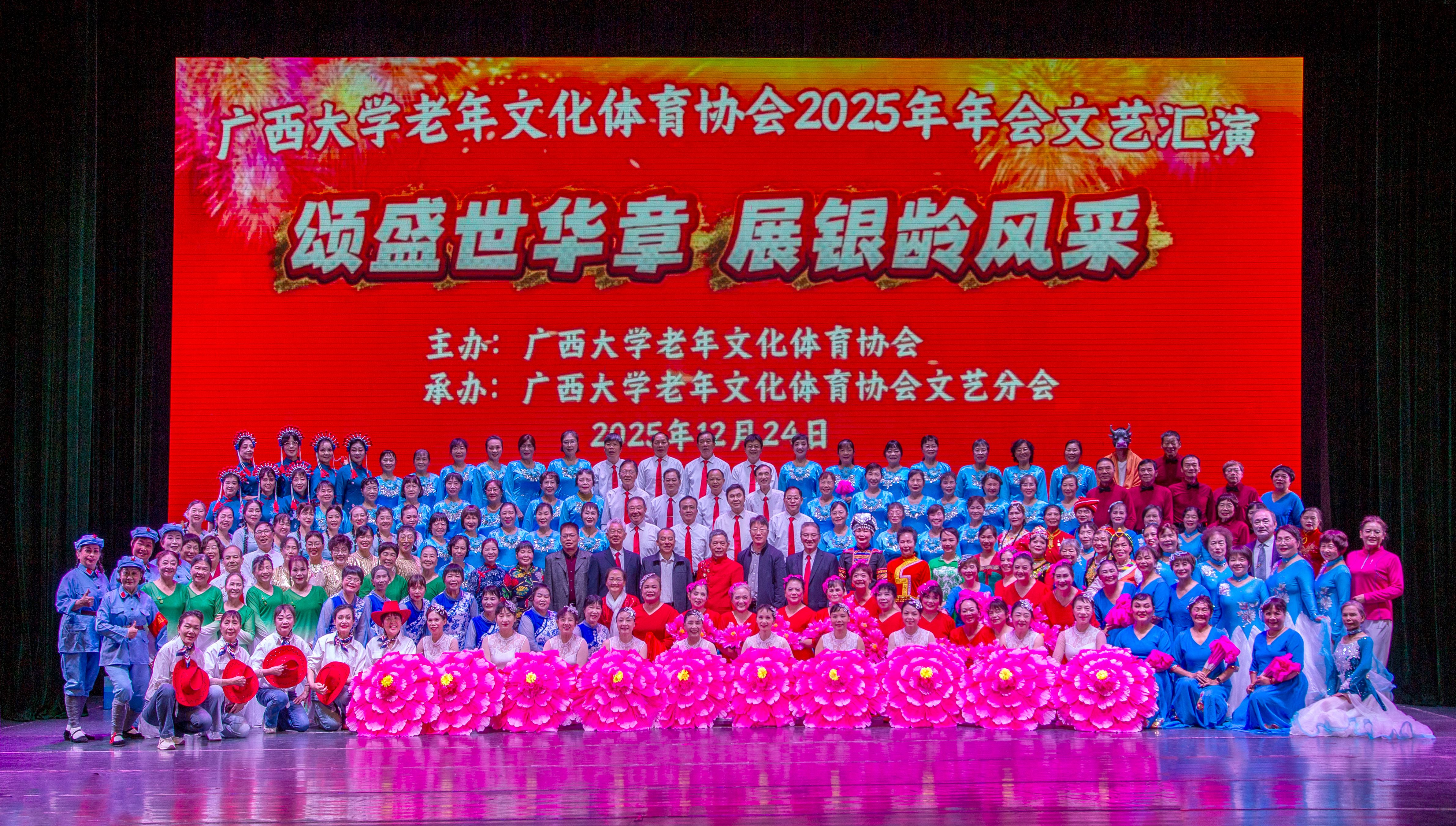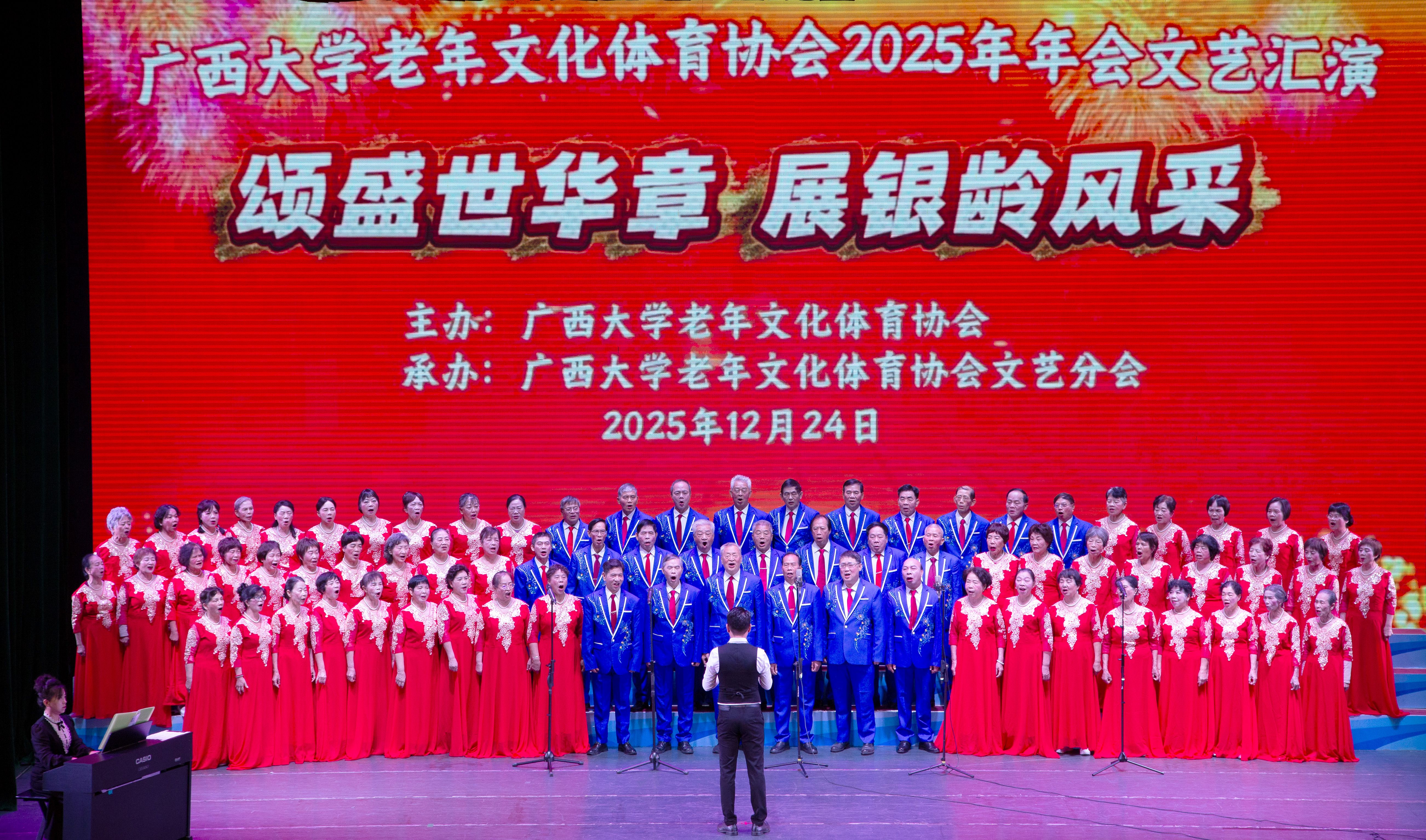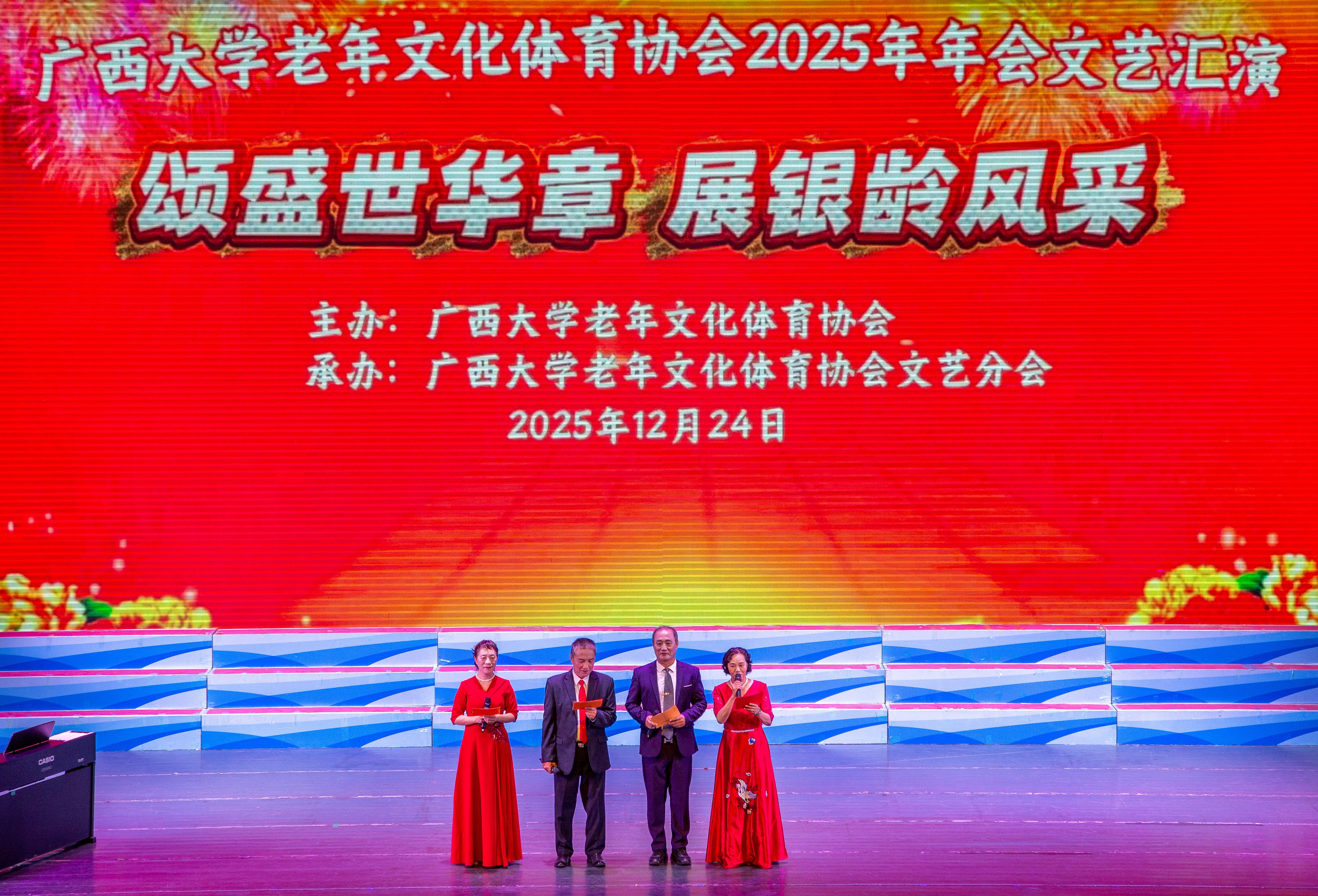 12月24日,我校老年文体协会以“颂盛世华章 展银龄风采”为主题的2025年年会演出在校大礼堂圆满举行。老年文体协会会员、离退处领导及嘉宾欢聚一堂,共同欣赏了这场充满活力与温情的文艺盛宴。