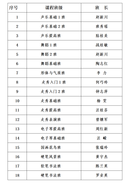 老年大学2022-2023学年各课程班级班长