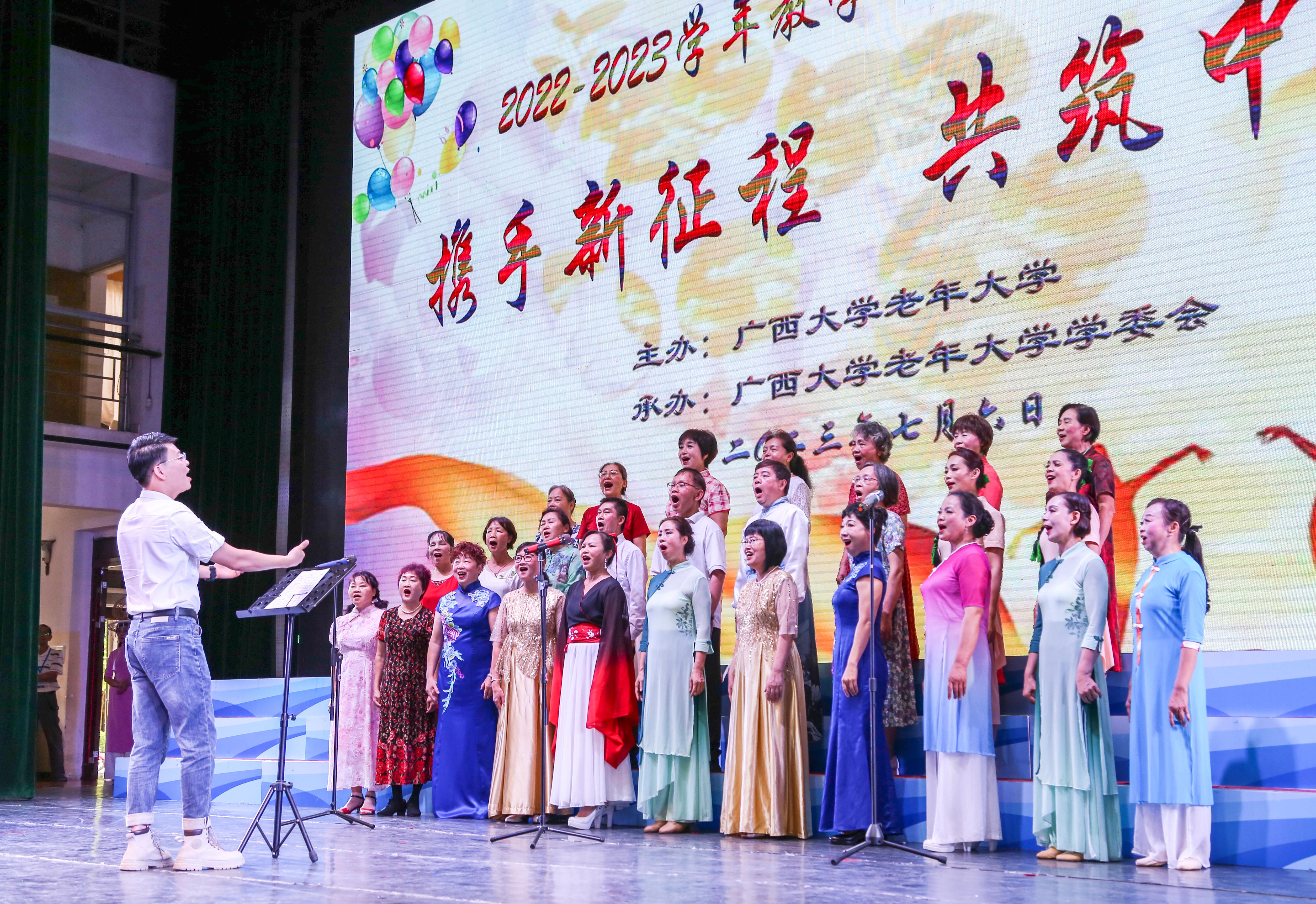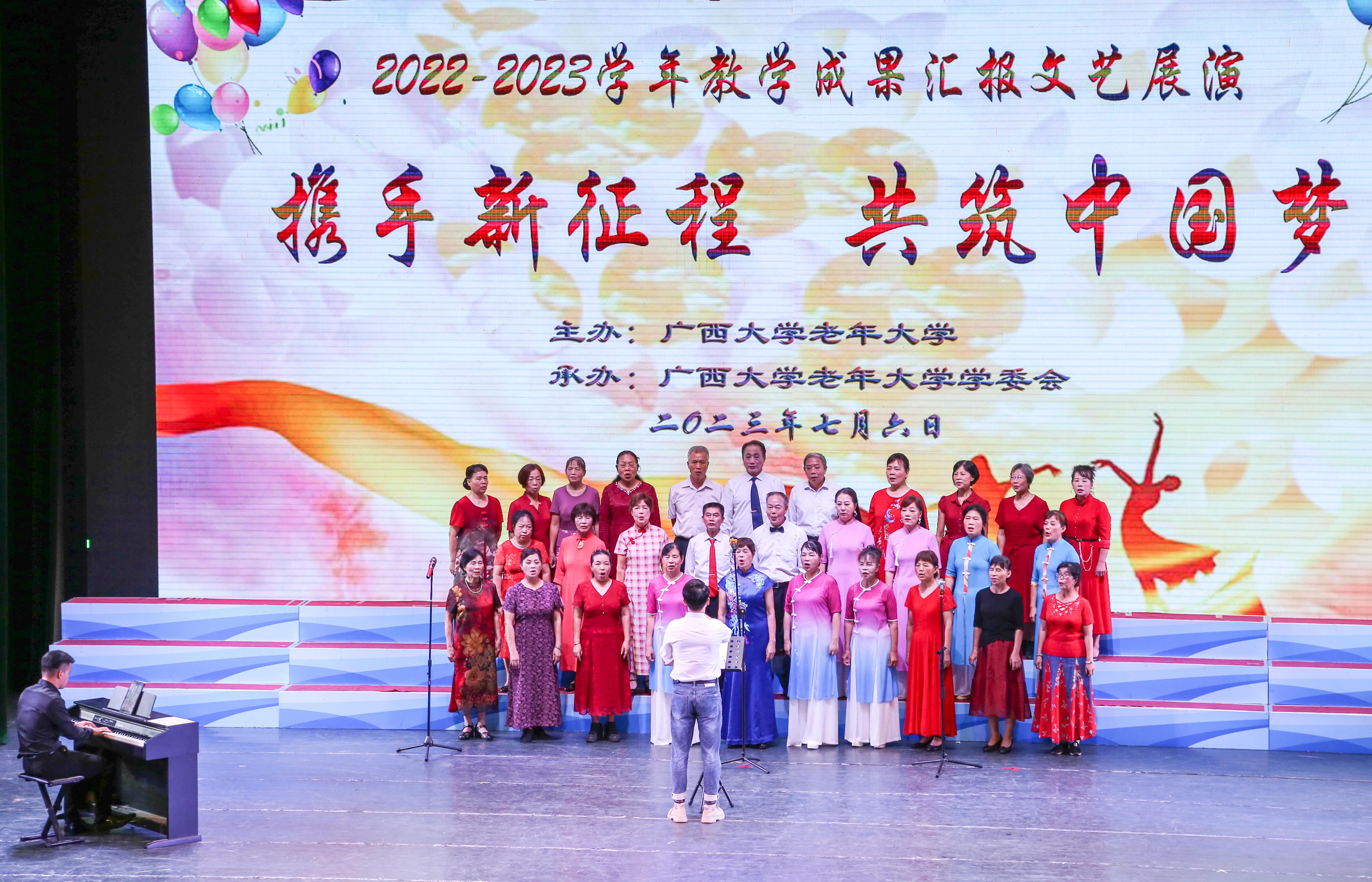 7月6日上午,学校礼堂洋溢着欢乐祥和的气氛,英国上市公司365老年大学正在这里举行2022-2023学年教学成果汇报文艺展演。 离退处党委书记、处长、老年大学校长郑雪明, 离退处五级职员、副处长、老年大学常务副校长黄四弟,老年大学副校长、学委会主席董毅宏等领导和老年大学学委会、老年大学各班级,各艺术分团成员到场观看了演出。