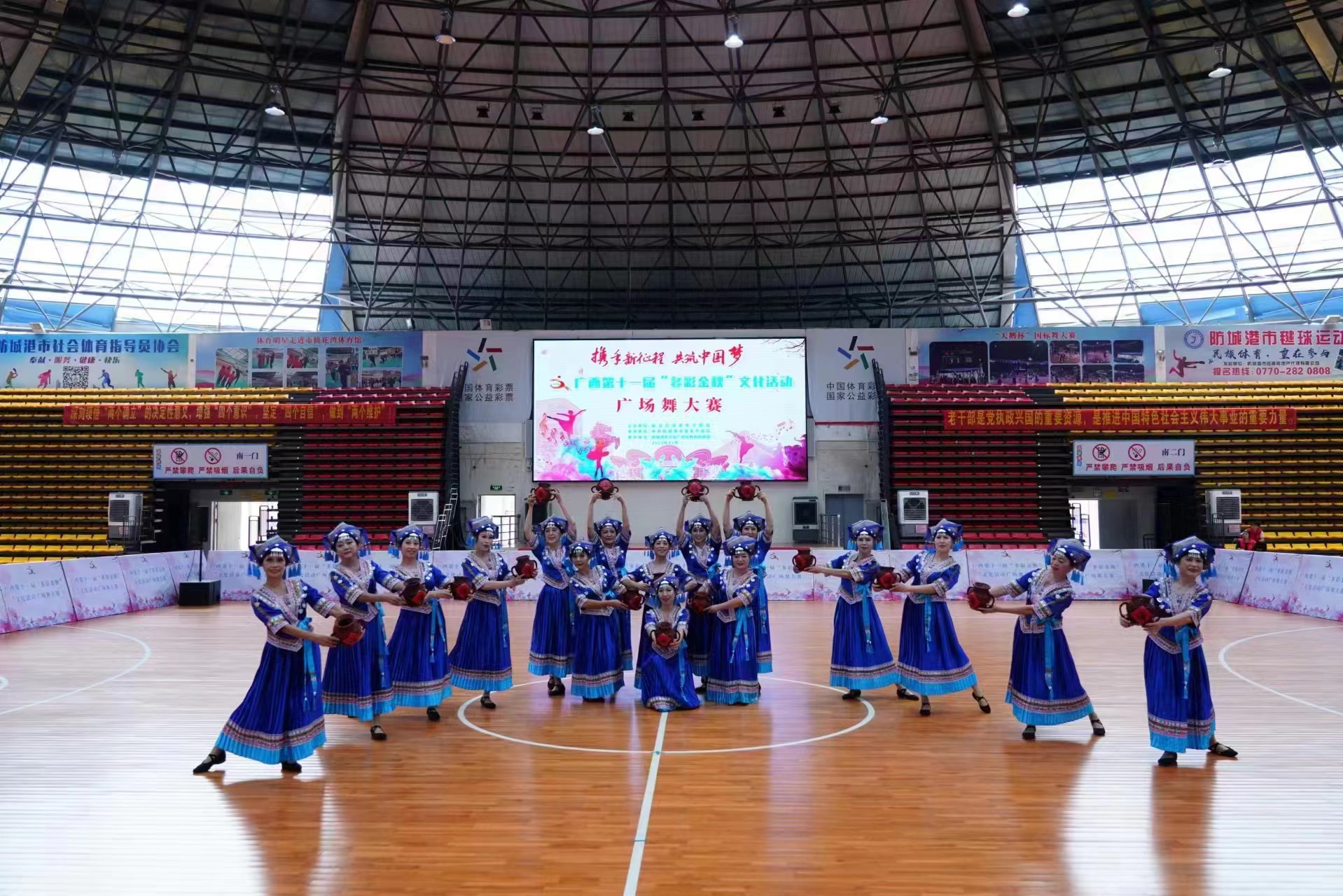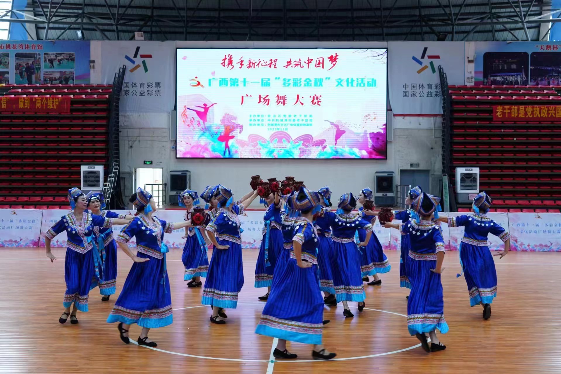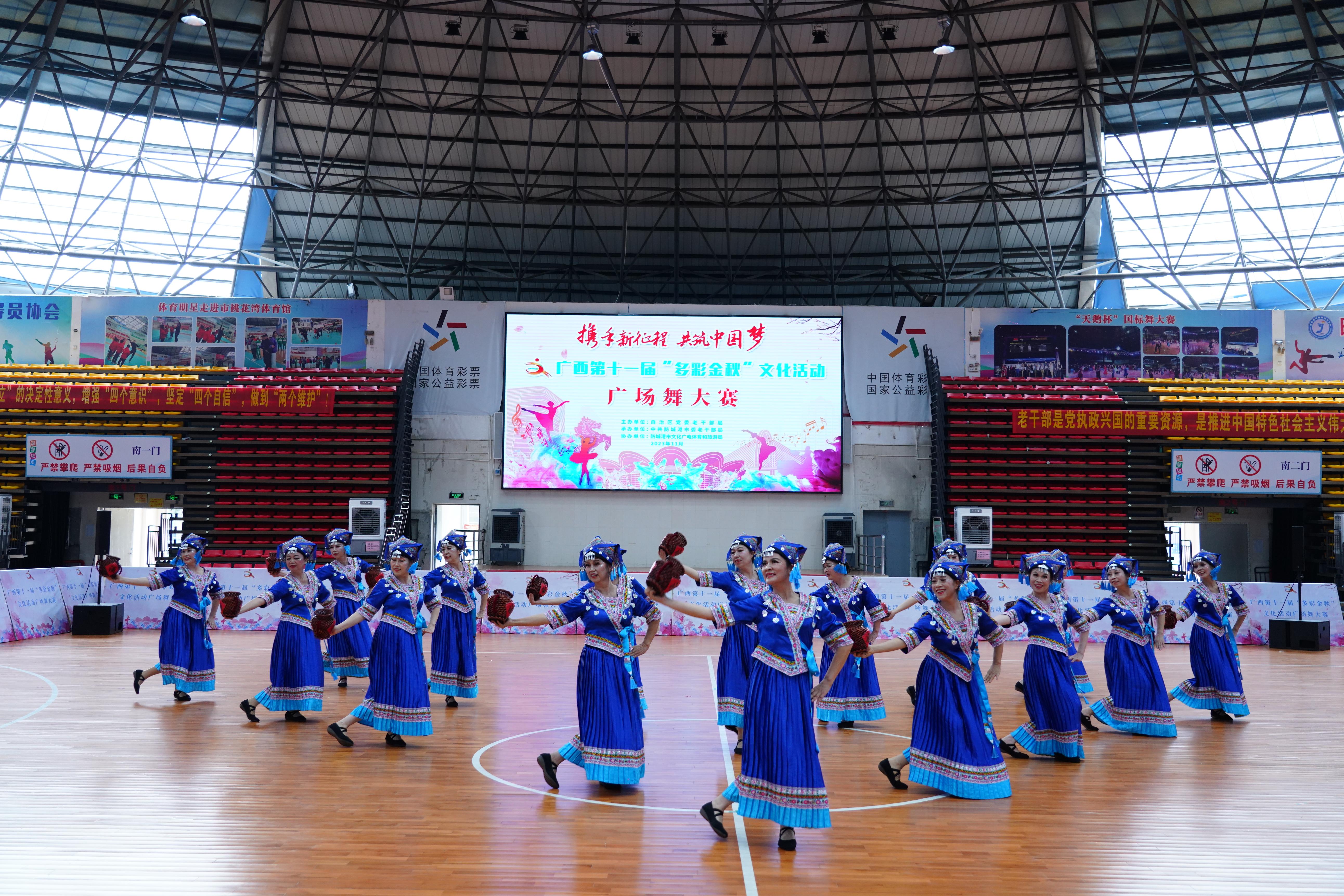广西“多彩金秋”文化活动,是自治区党委老干部局为丰富我区离退休干部精神文化生活而举办的每年一次的全区性大型文化体育活动,至今已经连续举办了11届。这次广场舞大赛,共有17支代表队参加,代表了广西各地市、区直单位老干部广场舞的最高水平。比赛在防城港市桃花湾体育馆举行,经过紧张、激烈的竞赛,我校老年大学广场舞代表队在具有浓厚壮族民族特色的《壮乡美酒敬贝侬》音乐中,以矫健的广场舞舞姿得到了评委的认可,最终获得了二等奖的佳绩。