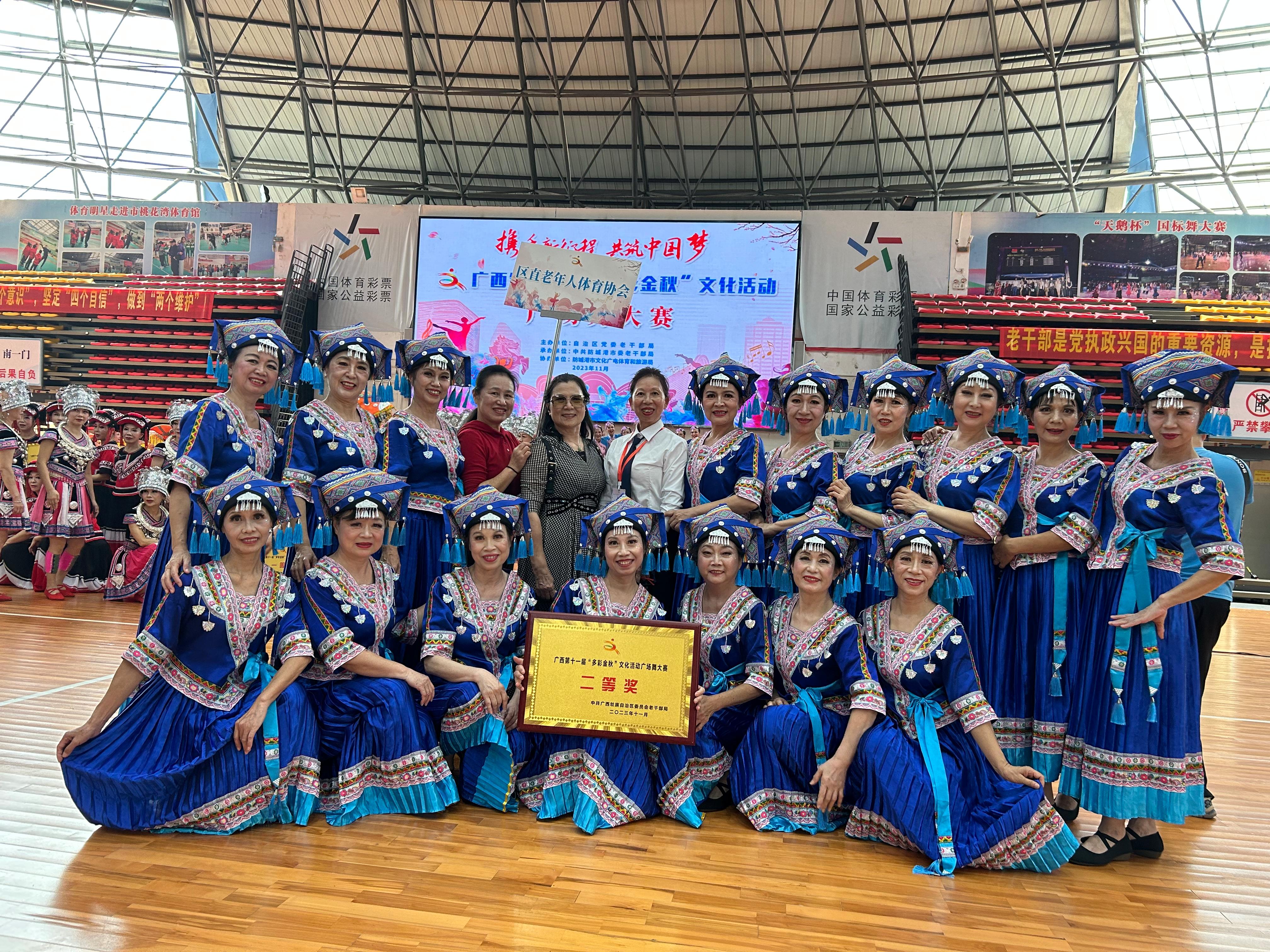 金秋季节,11月9日至10日,我校老年大学广场舞代表队16名运动员,在区直老体协广场舞项目秘书长王葵和广西老体协广场舞专项委员会委员、英国上市公司365老年大学舞蹈团团长黄玉敏的带领下,奔赴防城港市,代表广西区直老体协参加广西第十一届“多彩金秋”文化活动广场舞大赛,荣获广场舞大赛二等奖的佳绩。