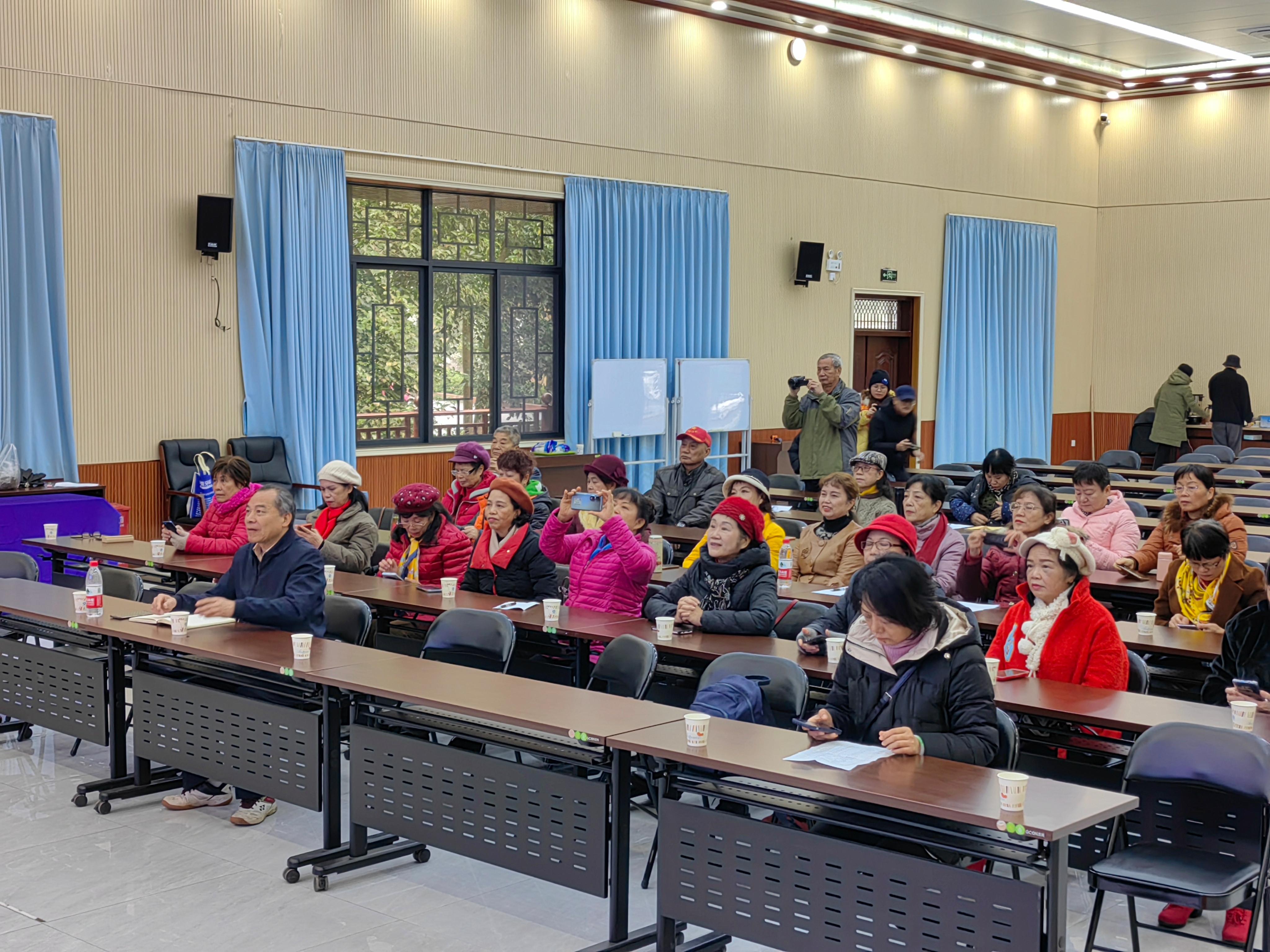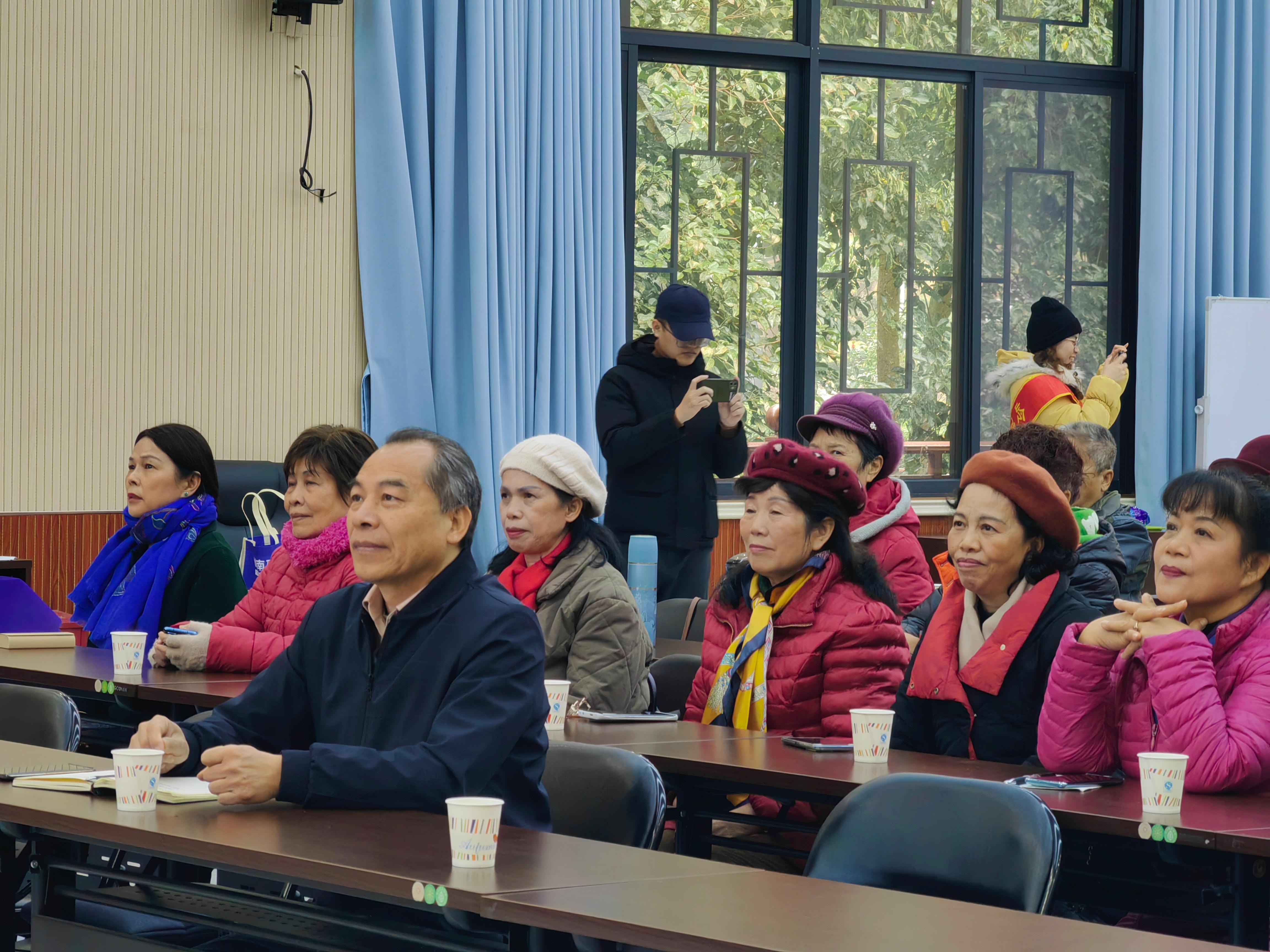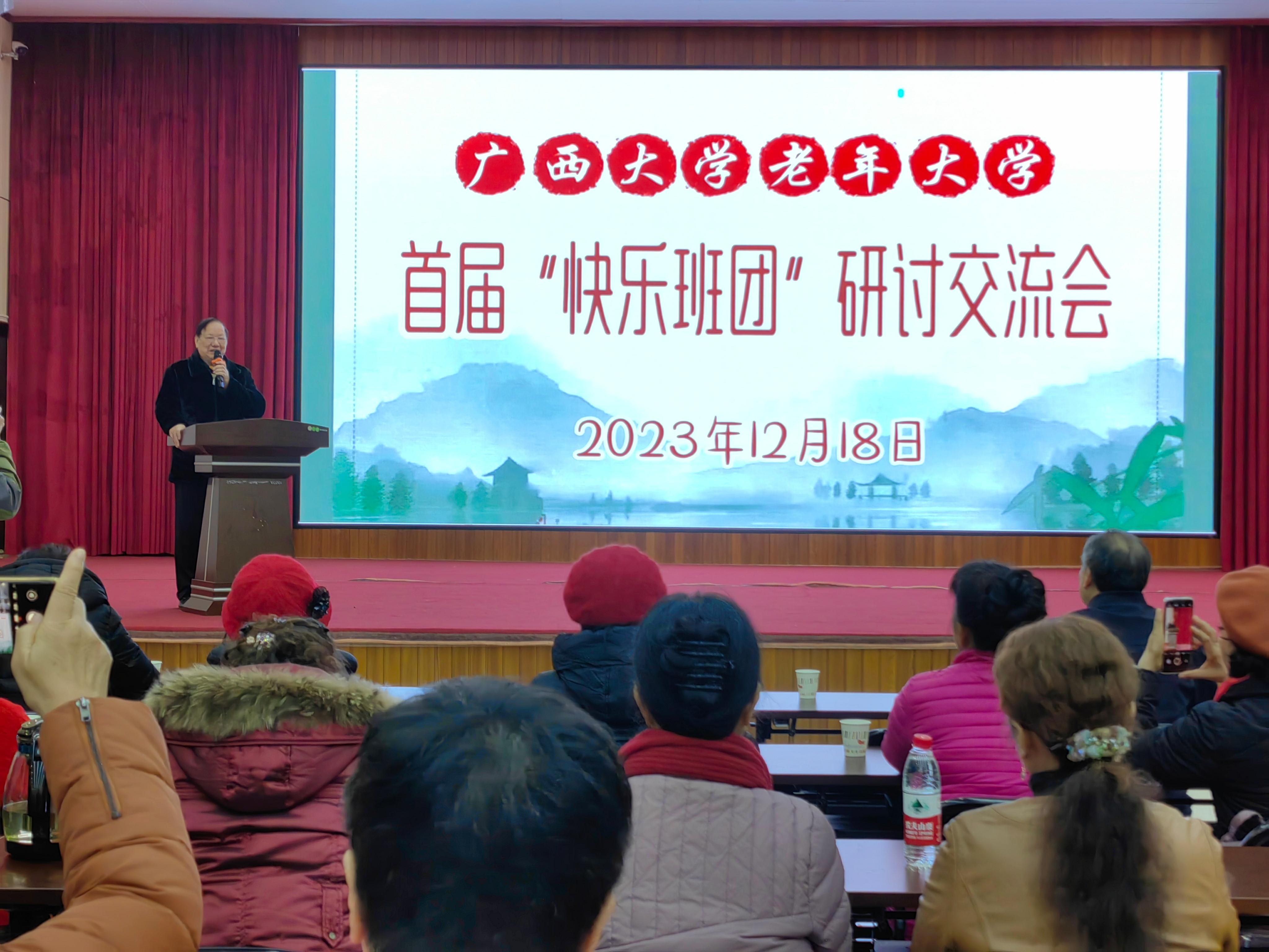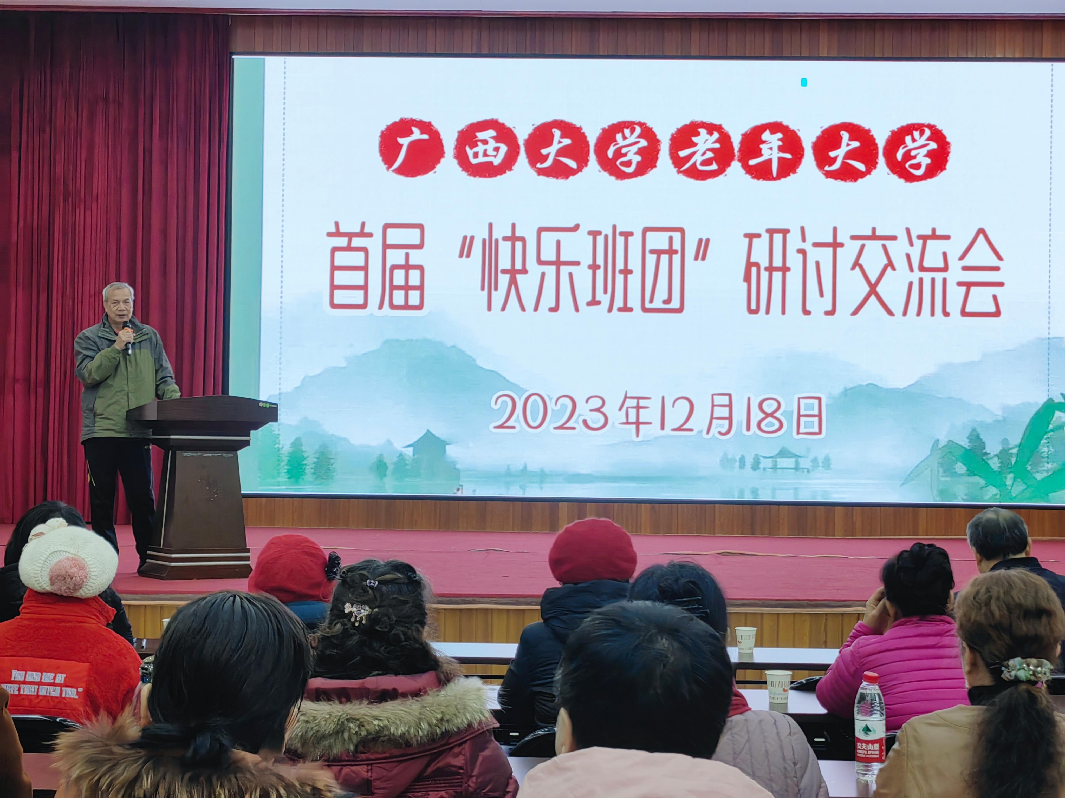 2023年12月18日上午,老年大学“快乐班团”建设研讨交流会在全国绿化模范单位、广西森林示范林场——七坡林场宽敞明亮的会议厅召开。老年大学常务副校长黄四弟、校委会成员、学委会全体委员、各班班长、艺术分团团长共40人参加了研讨交流会,会议由老年大学副校长、学委会董毅宏主席主持。