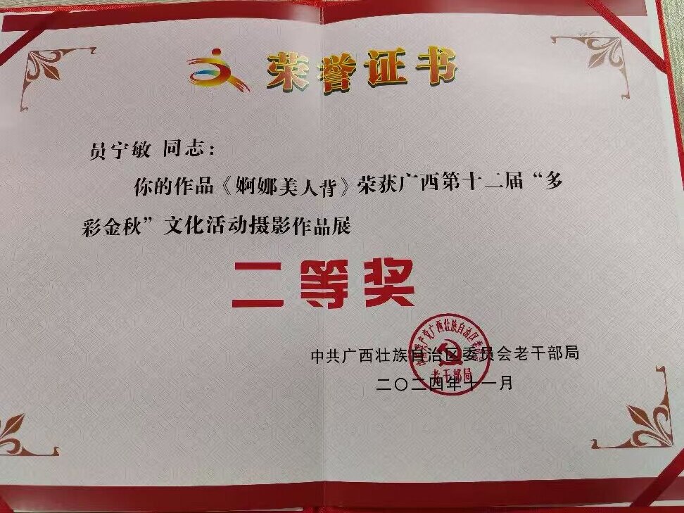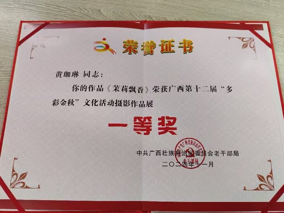 近日,广西第十二届“多彩金秋”文化活动项目之一——摄影作品展圆满落幕,我校老年大学学员黄珈琳的作品《茉莉飘香》荣获摄影作品展一等奖、员宁敏的作品《婀娜美人背》荣获二等奖,为我校参加广西“多彩金秋”文化活动摄影作品展历届以来最好成绩。