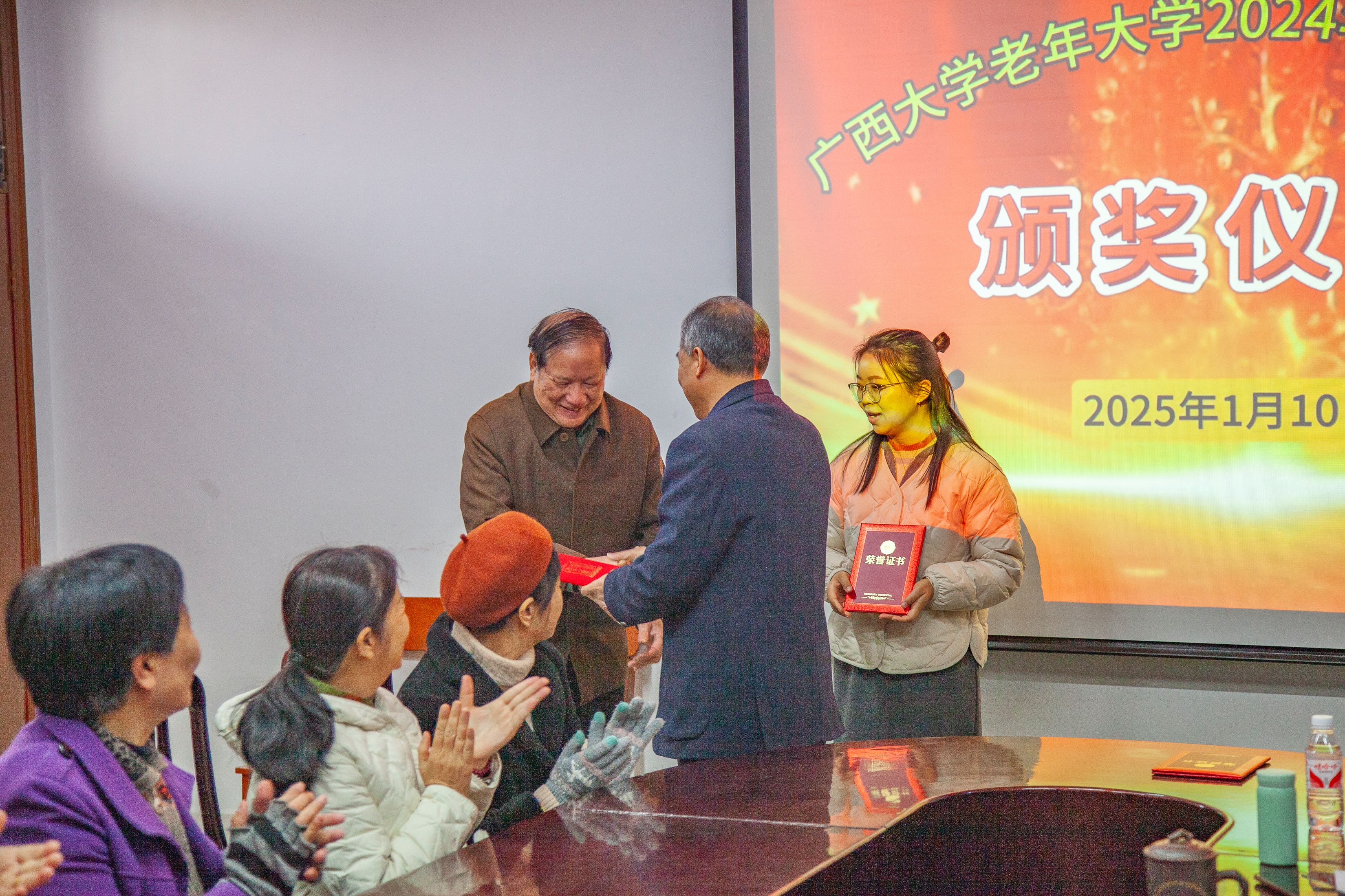会议伊始,校离退休工作处副处长张浩宣读了广西老年大学协会关于表彰第五届全区老年大学理论研讨征文活动优秀科研成果的决定,我校老年大学选送的三篇论文分别荣获了一、二、三等奖。老年大学常务副校长黄四弟为获奖人员颁发了荣誉证书,在场所有人员用热烈的掌声祝贺获奖者取得的喜人成绩。