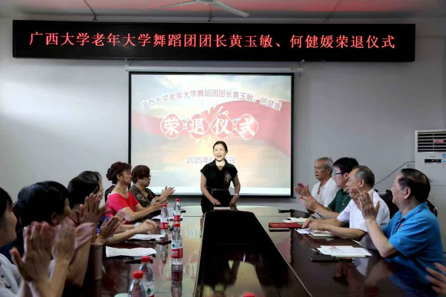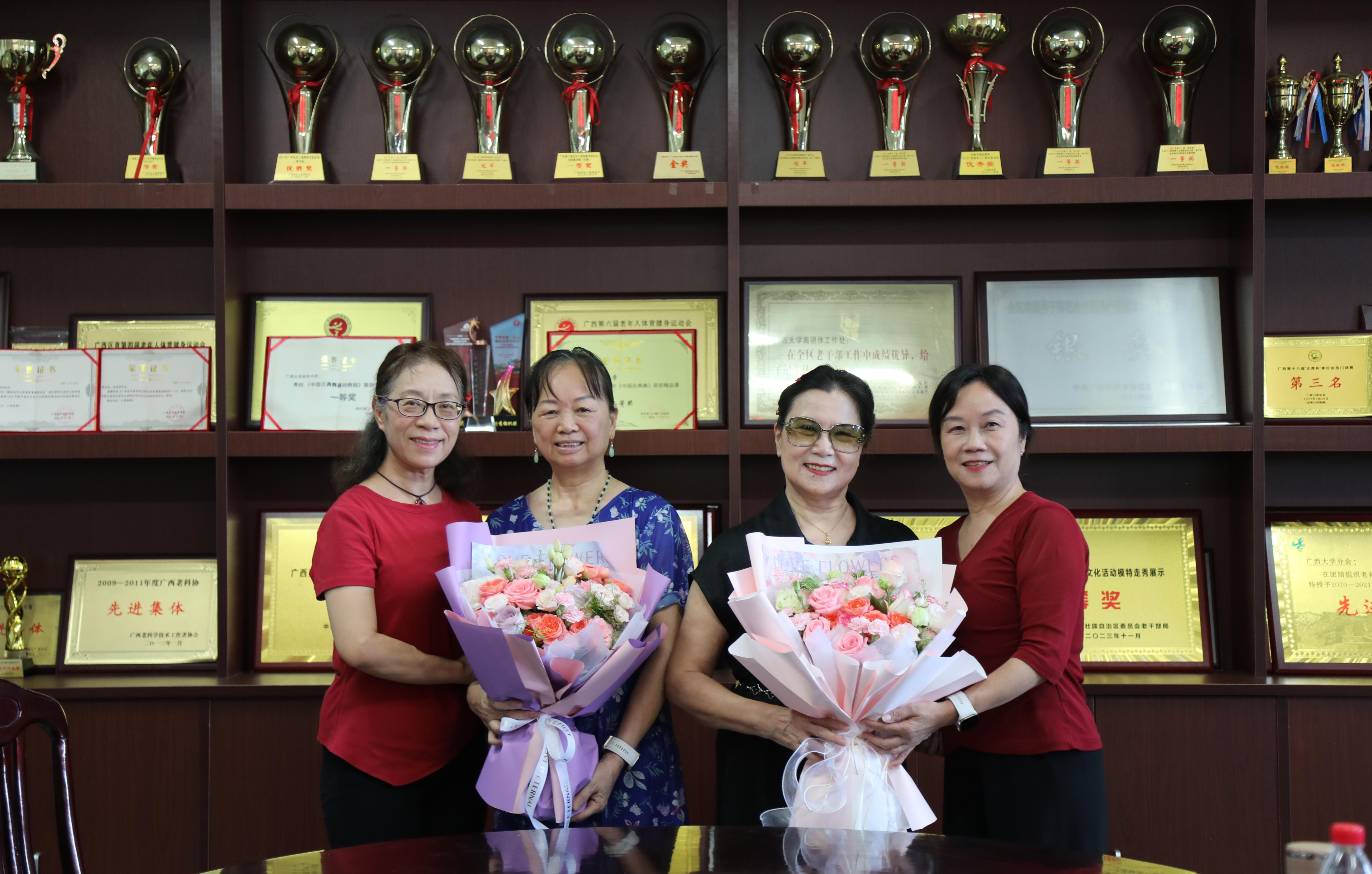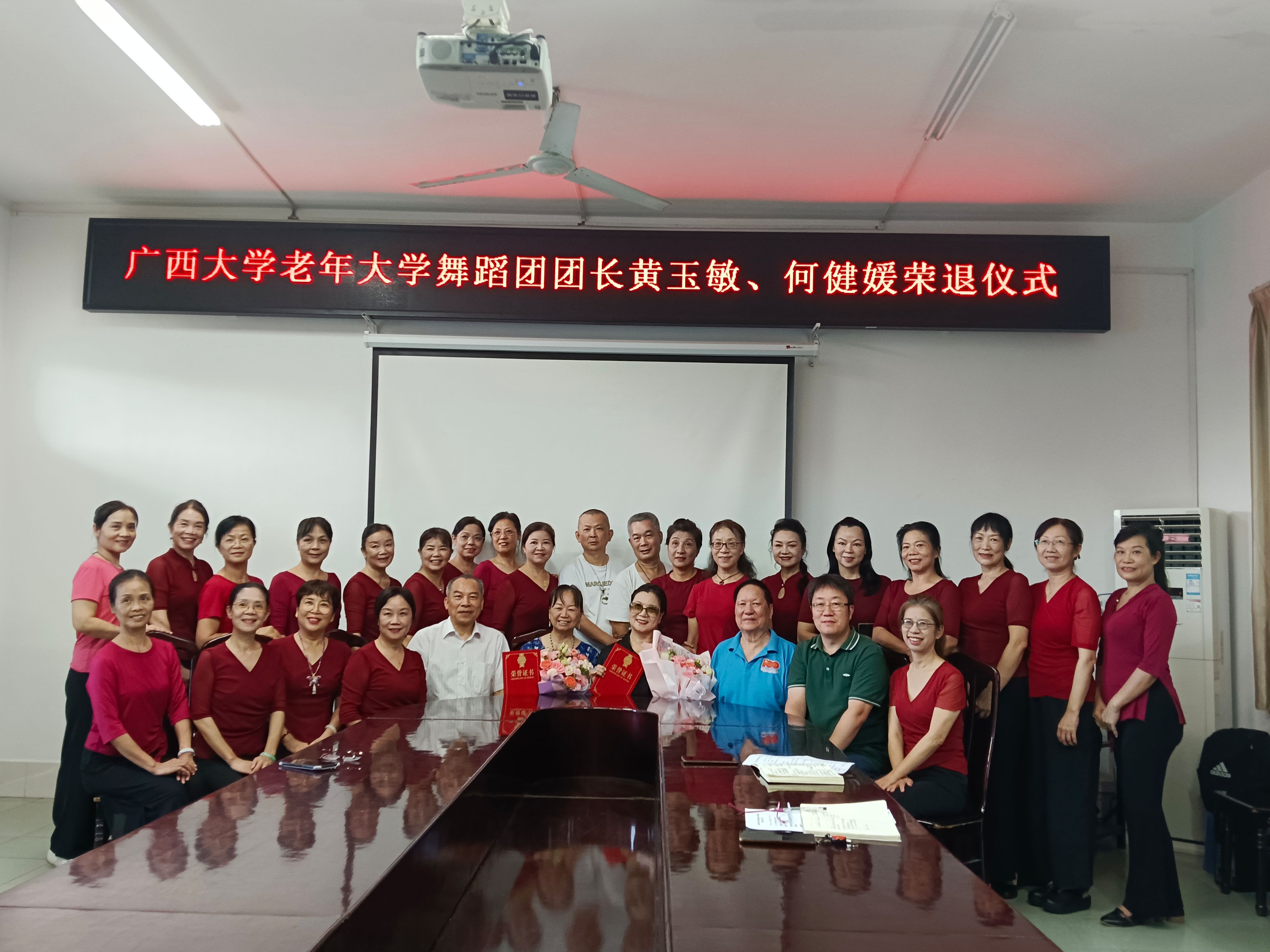 6月26日下午,我校老年大学在西校园离退休教职工活动中心三楼会议室为舞蹈团团长黄玉敏、名誉团长何健媛举行荣退仪式。仪式由老年大学副校长董毅宏主持,老年大学常务副校长黄四弟、副校长张浩、学委会委员、艺术团各分团团长及舞蹈团新成员等36人参加仪式,共同见证了这一庄重而温馨的时刻。