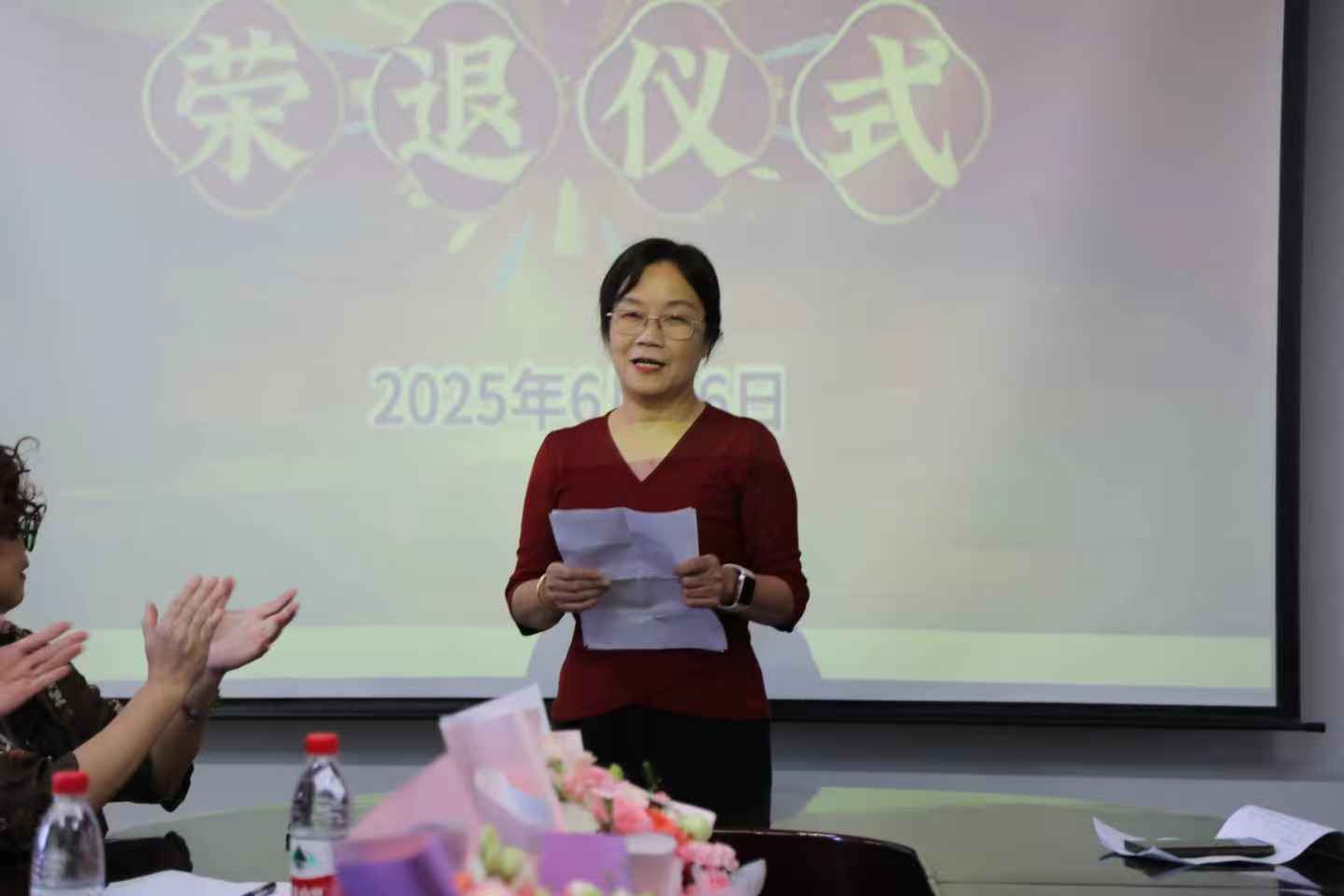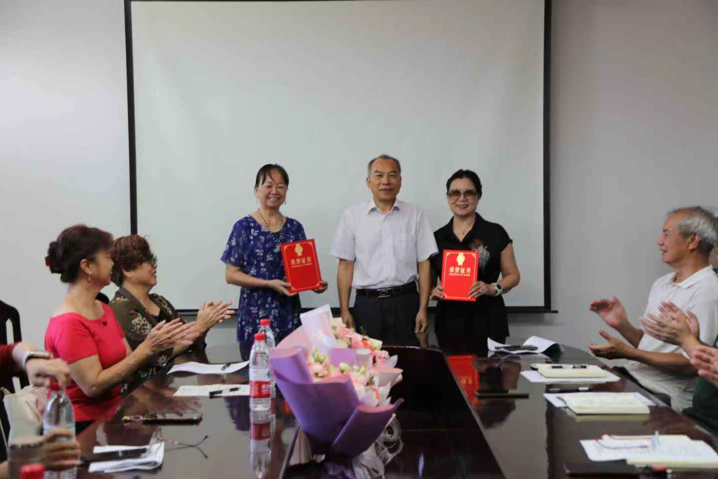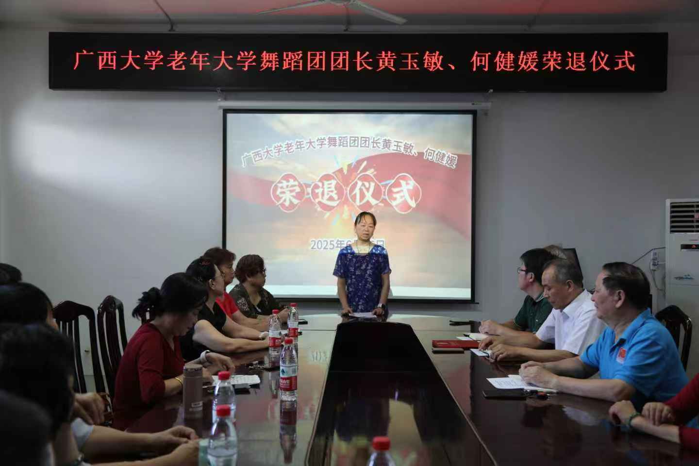 6月26日下午,我校老年大学在西校园离退休教职工活动中心三楼会议室为舞蹈团团长黄玉敏、名誉团长何健媛举行荣退仪式。仪式由老年大学副校长董毅宏主持,老年大学常务副校长黄四弟、副校长张浩、学委会委员、艺术团各分团团长及舞蹈团新成员等36人参加仪式,共同见证了这一庄重而温馨的时刻。